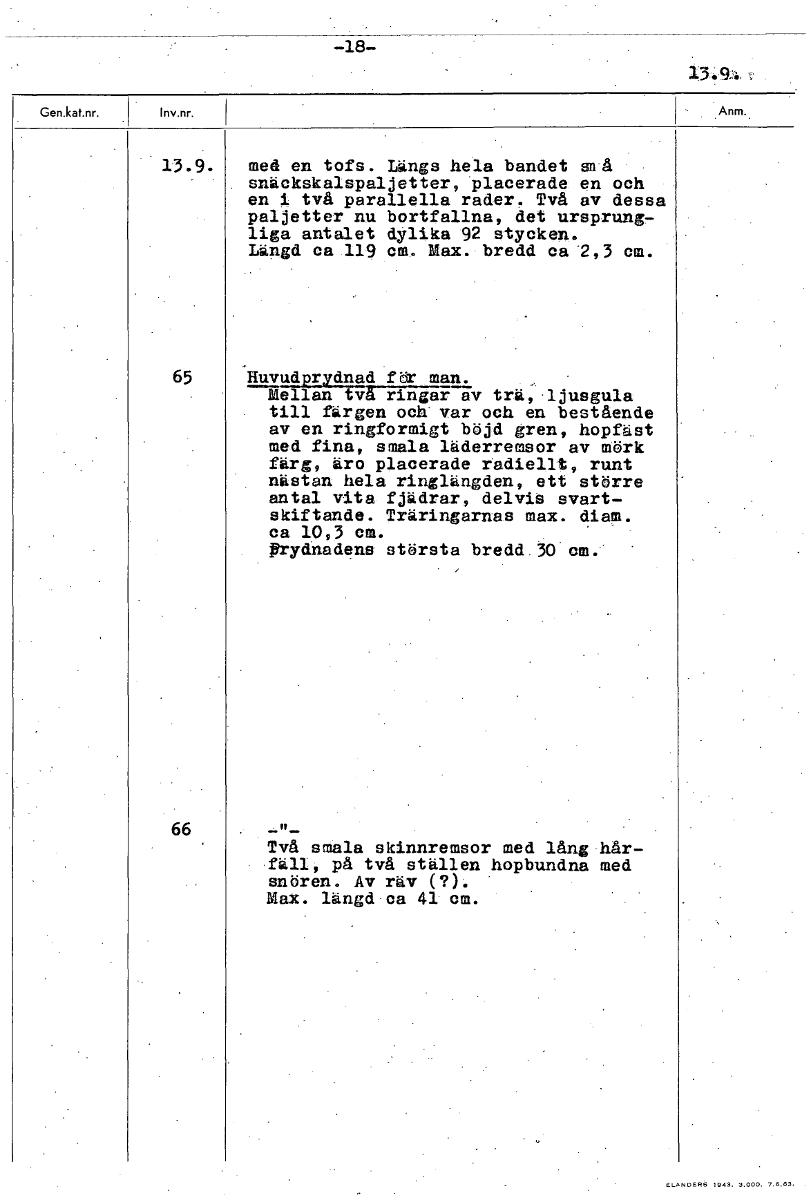 -18- 9)1. 13.9. med en tofs. Längs hela bandet må snäckskalspaljetter, placerade en och en i två parallella rader. Två av dessa paljetter nu bortfallna, det ursprung- liga antalet dylika 92 stycken. L...