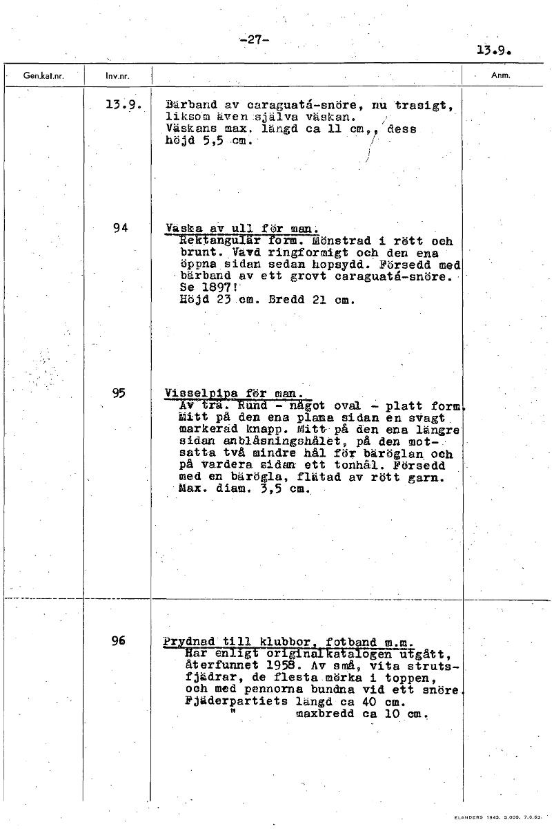 139. 13.9. Bärband av caraguatå-snöre, nu trasigt, liksOm även :själva väskan. .Väskans max. längd ca 11 cm, dess. höjd 5,5 -cm.. 94 Väska av ull för man. RanirgragfWffftfilönstrad i rött och brunt. Vävd ringformigt och den ena öppna sidan sedan hopsydd. Försedd med bärband av ett grovt caraguatå-snöre. Se 1897! lTöjd 23 cm. Bredd 21 cm. 95 Visselpipa för man. Av trd. Rund - något oval - platt form Mitt på den ena plana sidan en svagt markerad knapp. Mitt på den ena längre sidan anblåsningshålet, på den mot- satta två mindre hål för bäröglan och på vardera sidan ett tonhål. Försedd med en bärögla, flätad av rött garn. Max. diam. 3,5 cm. 96 Pr dnad____,tillklubbor fotband m.m. tar åffliä-töflifiiiirkatalogen utgått, återfunnet 1958. Av små, vita struts- fjädrar, de flesta mörka i toppen, och med pennorna bundna vid ett snöre Fjäderpartiets längd ca 40 cm. maxbredd ca 10 an. [ocr]
