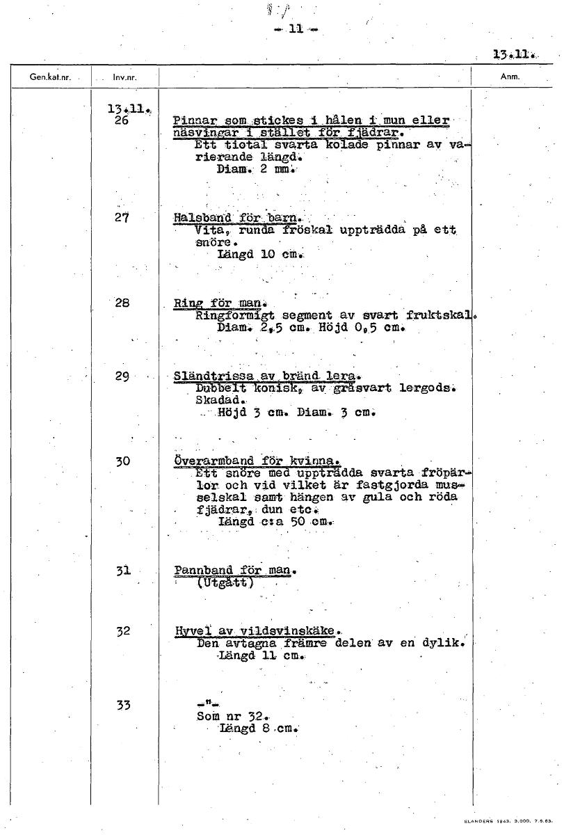 26 Pinnar som stickes i hålen i mun eller näsvingar i stället för f:tädrar. Ett tiotal svarta kolade pinnar av va rierande längd. Diam. 2 ram'. 27 Halsbarid 'för 'barn. , - Vita9 runda fröskal uppträd...Visa hela