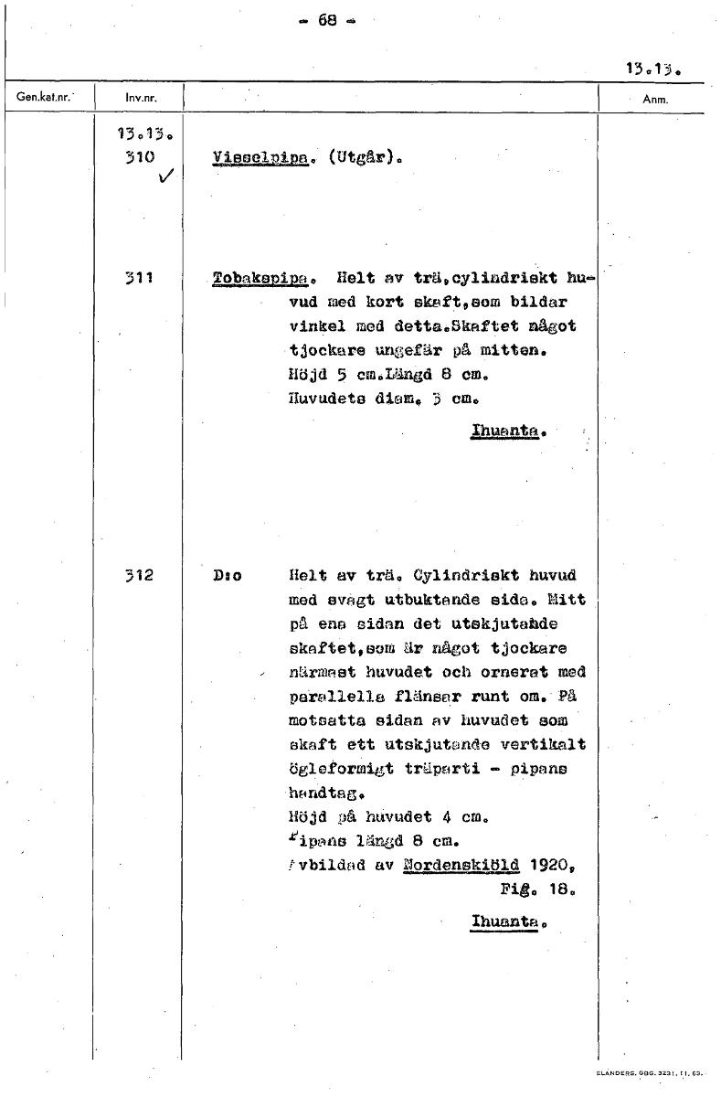 13.13. 13.13. 310 Vi...121.2k2„, (Utgår). 311 Tobakspipa. Helt av trä.cylindriskt hu- vud red kort skaft.som bildar vinkel med detta.Skaftet något tjockare ungefär på mitten. Höjd 5 cm.Lånd 8 cm. Huvu...Visa hela