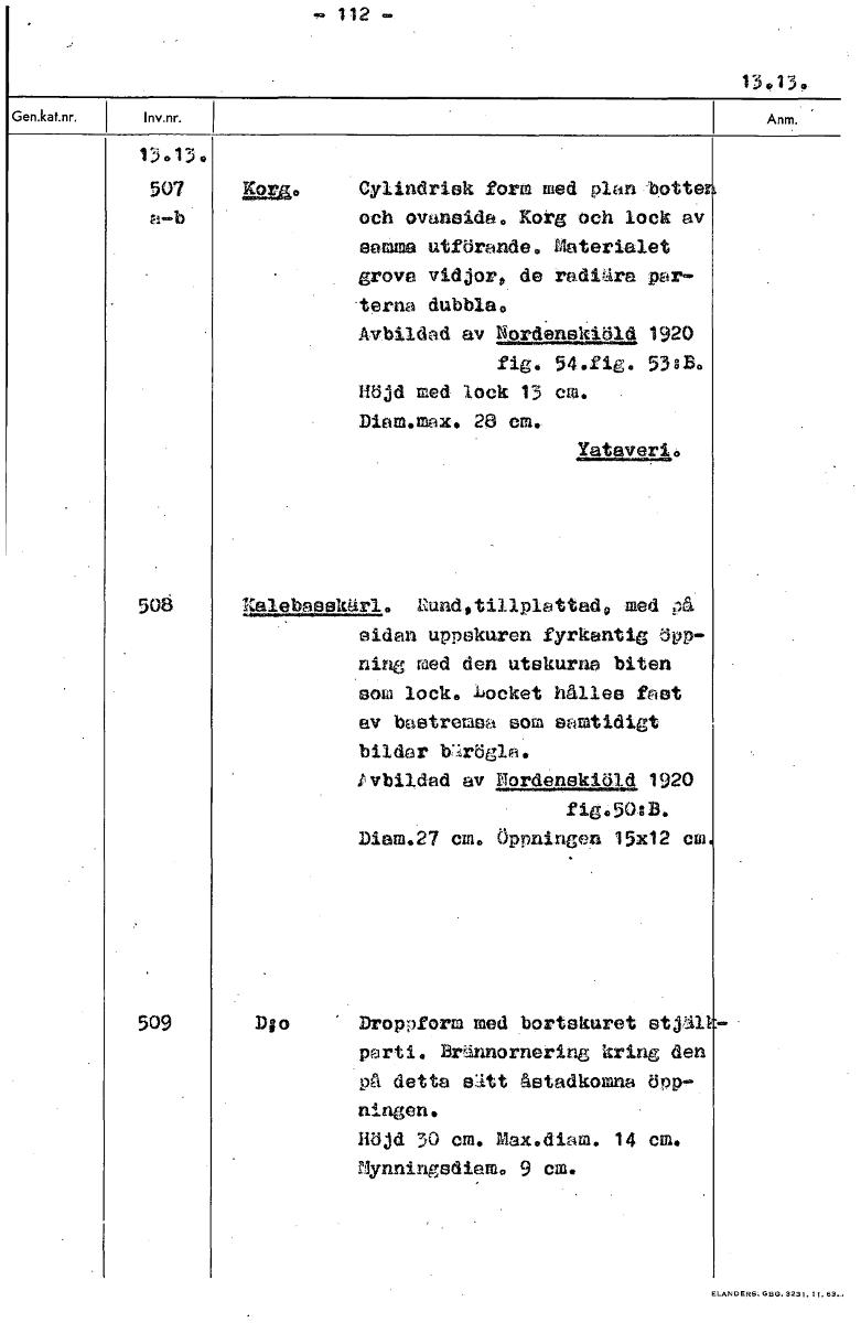 112- 13.13. 15.13. 507 DM* Cylindrisk form med plan botte a-b och ovanoida. Korg och lock av samma utförande. Materialet grove vidjort de rediAra par- tema dubbla. Avbildad av Nordenskiöld 1920 fig. 54.fig. 53:B. Nöjd med lock 13 cm. Diam.max. 28 cm. Yataverk0 508 naleb sekarl. Rundotillplattad9 med på sidan uppskuren fyrkantig öpp- ning med den utekurna biten som lock. 1,ocket hålles fast av baetremsa som stotidigt bildar bröglai. tvbildad av Nordenskiöld 1920 fig.50:B. Diem.27 cm. Öppningen 15x12 cm 509 Dg> Droppform med bortskuret stjäl parti. Brdnnornering kring den på detta ett åstadkomna öpp- ningen. Höjd 30 cm. Max.diam. 14 cm. Mynningsdiam. 9 cm. [ocr]Stäng