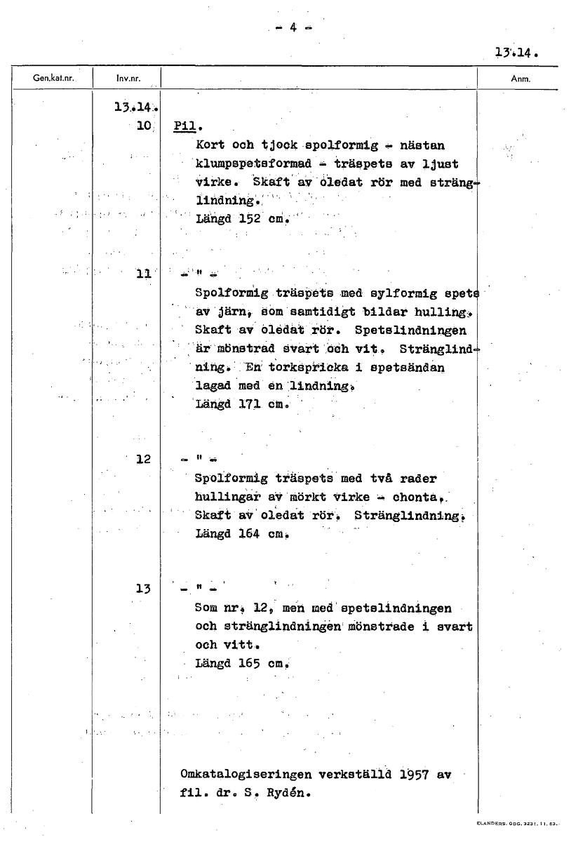 -4 13..14.. 10 Pil. Kort och tjock spolformig - nästan klumpspetsformad träspets av ljust virke. Skaft 'av °ledat rör med sträng Längd 152 cm. 11' Spolformig träspets med sylformig spat av järn, dom samtidigt bildar hulling,. ' Skaft av oledat rör. Spetslindningen år mönstrad Svart 'Oh vit. Stränglind ning. En' torkspricka i opetsändan lagad med en lindning Längd 171 om. 12 ~ Spolformig träspets med två rader hullingar av 'mörkt virke - chonta0. Skaft av'oledat röro Stränglindning Längd 164 cm: 13 Som nr.p 120 men med'spetelindningen och stränglindningan' mönstrade i svart och vitt. Längd 165 cm. Omkatalogiseringen verkställd 1957 av fil. dr. S. Rydén. [ocr]Stäng