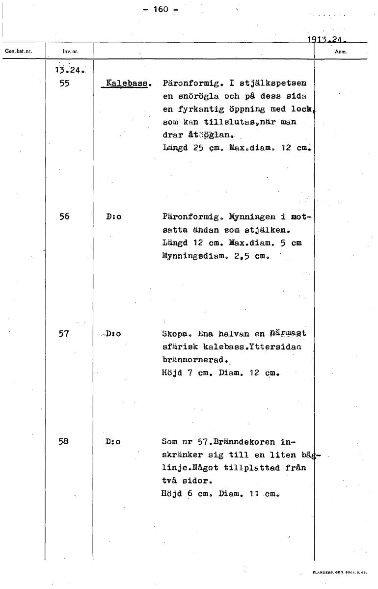 160 1913.24. 55 Kalebass. Päronformig. I stjälkspetsen en snörögla och på dess sida en fyrkantig öppning med lock som kan tillslutas,när man drar åt:spälan. Längd 25 cm. Max.diam. 12 cm. 56 D:o Päronformig. Mynningen .i mot- satta ändan som stjälken. Längd 12 cm. Max.diam. 5 cm Mynningsdiam. 2,5 cm. 57 Skopa. Ena halvan en PäPMast sfärisk kalebass.Yttersidan brännornerad. Höjd 7 cm. Diam. 12 cm. 58 D:o Som nr 57.Bränndekoren in- skränker sig till en liten bå linje.Något tillplattad från två sidor. Höjd 6 cm. Diam. 11 cm. [ocr]Stäng