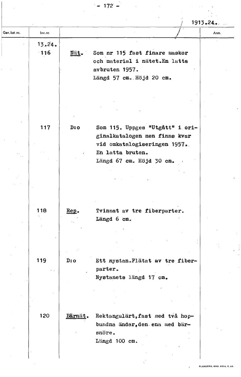 -- 172 - 1913 13.24. 116 Ntit . Som nr 115 fast finare maskor och material i nätet.En latta avbruten 1957. Längd 57 cm. Höjd 20 cm. 117 D:o Som 115. Uppges "Utgått" i ori- ginalkatalogen men finns kva...Visa hela