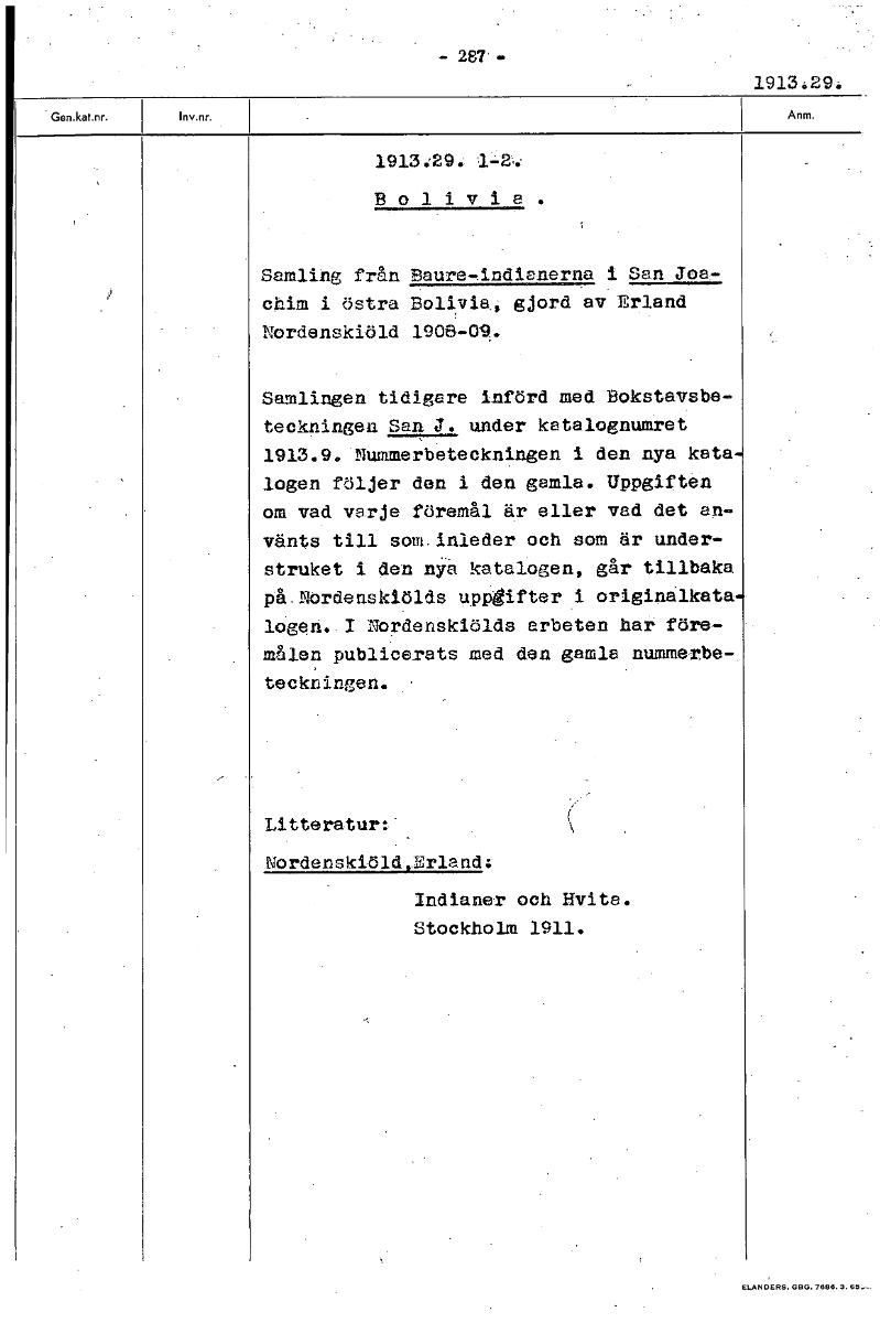 - 287. - 19134.29: 1913 :29: Bolivia. Samling från Baure-indianerna i San Joa- chim i östra Bolivia, gjord av Erland Nordenskiöld 1908-09. Samlingen tidigare införd med Bokstavsbe- teckningen San J. under katalognumret 1913.9. Nummerbeteckningen i den nya kata- logen följer den i den gamla. Uppgiften om vad varje föremål är eller vad det an- vänts till som. inleder och som är under- struket i den nYa katalogen, går tillbaka på.NOrdenskiölds uppgifter 1 originalkataf. logen. Nordenskiölds arbeten har före- målen publicerats med den gamla nummerbe- teckningen. • Litteratur:• Nordenskiöld,Erlend; Indianer och Bylta. Stockholm 1911. [ocr]Stäng