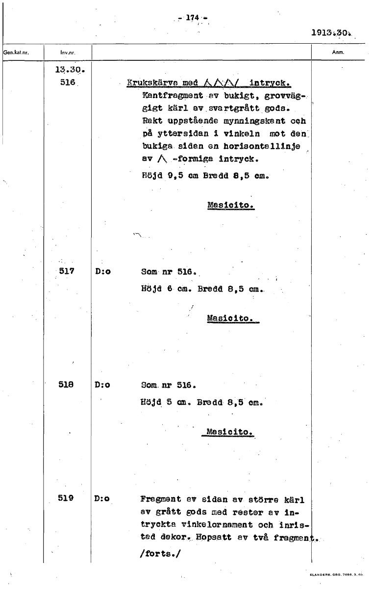 13.3Q. 516 1220222ä-11191-Ltg.V.IltriaL Kantfram!ent av bukigt, grovväg- gigt kärl av.martgrått gods. Rakt uppstående mynningskant och på yttersidan i vinkeln mot den bukiga siden en horisontellinje av -formIga intryck. Böjd 995 cm Bredd 895 cm. Masicito. 517 D:o Som nr 516. Höjd 6 cm. Bredd 895 em. Masicito. • 518 D:o Som. nr 516. Höjd 5 an. Bredd 895 cm. Masicito. 519 D:o Fregment ev sidan av större kärl av grått gods med rester av in- tryckta vinkelornament och inris- ted dekor. Hopsatt av två fragmen /forts./ [ocr]Stäng