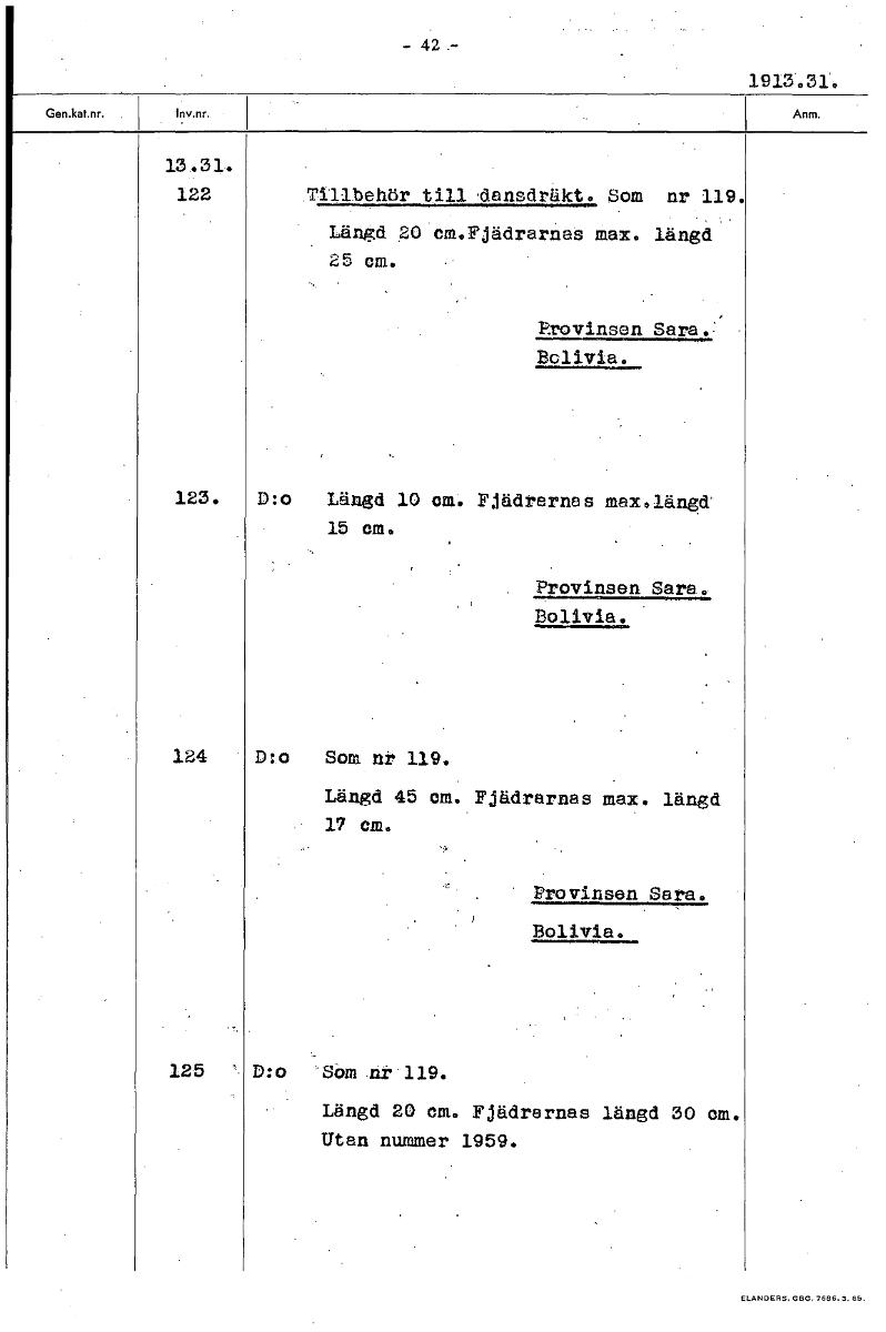 • - 42 - 1913..31. 13.31. 122 Tillbehör till dansdräkt. Som nr 119. Längd 20 cm.Fjädrarnas max. längd 25 cm. Provinsen Sara: Bolivia. 123. D:o Längd 10 om. Fjädrarnas max.längd 15 cm. • Provinsen Sara. ... Visa hela