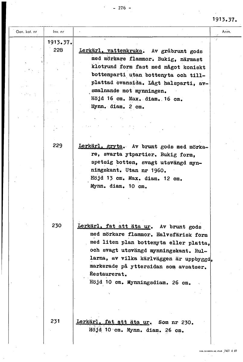 1913,37, 1913.37. 228 Lerkärl vattenkruka. Av gråbrunt gods med mörkare flammor. Bukig, närmast klotrund form fast med något koniskt bottenparti utan, bottenyta och till- plattad ovansida. Lågt halsparti, av. smalnande mot mynningen. Höjd 16 cm. Max. diam..16 om. Mynn. diam. 2 cm. 229 Lerkärl. fersrta,. Av brunt gods med mörka- re, svarta ytpartier. Bukig form, spetsig botten, svagt utsvängd myn- ningskant. Utan nr 1960. Höjd 13 om. Max. diam. 12 cm. Mynn. diam. 10 cm. 230 Lerkärl, fat att äta ur. Av brunt gods med mörkare flammor. Halvsfärisk form med liten plan bottenyta eller platta, och svagt utsvängd mynningskant. Rul- larna, av vilka kärlväggen är uppbyggd • markerade på yttersidan som avsatser, Restaurerat. Höjd 10 cm. Mynningsdiam. 26 cm. 231 Lerkärl, fat att äta ur. Som nr 230. Höjd 10.cm. Mynn. diam. 26 cm.. [ocr]