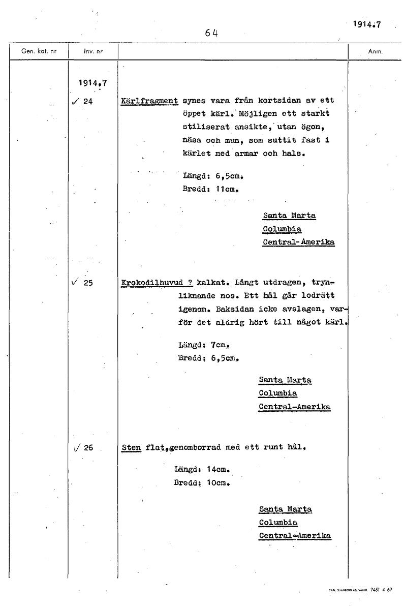 19147 64 1914.7 ✓ 24 Kärlfragment synes vara från kortsidan av ett öppet kärl. Möjligen ett starkt stiliserat ansikte, utan ögon, näsa och mun, som suttit fast i kärlet med armar och hals. Längd: 6,5cm. Bredd: 11cm. Santa Marta Columbia Central- Amerika 25 Krokodilhuvud ? kalkat. Långt utdragen, trynliknande nos. Ett hål går lodrätt igenom. Baksidan icke avslagen, varför det aldrig hört till något kärl. Längd: 7cm. Bredd: 6,5cm. Santa Marta Columbia Central-Amerika. 26 Sten flat, genomborrad med ett runt hål. Längd: 14cm. Bredd: 10cm. Santa Marta Columbia Central-rAmerika [ocr]