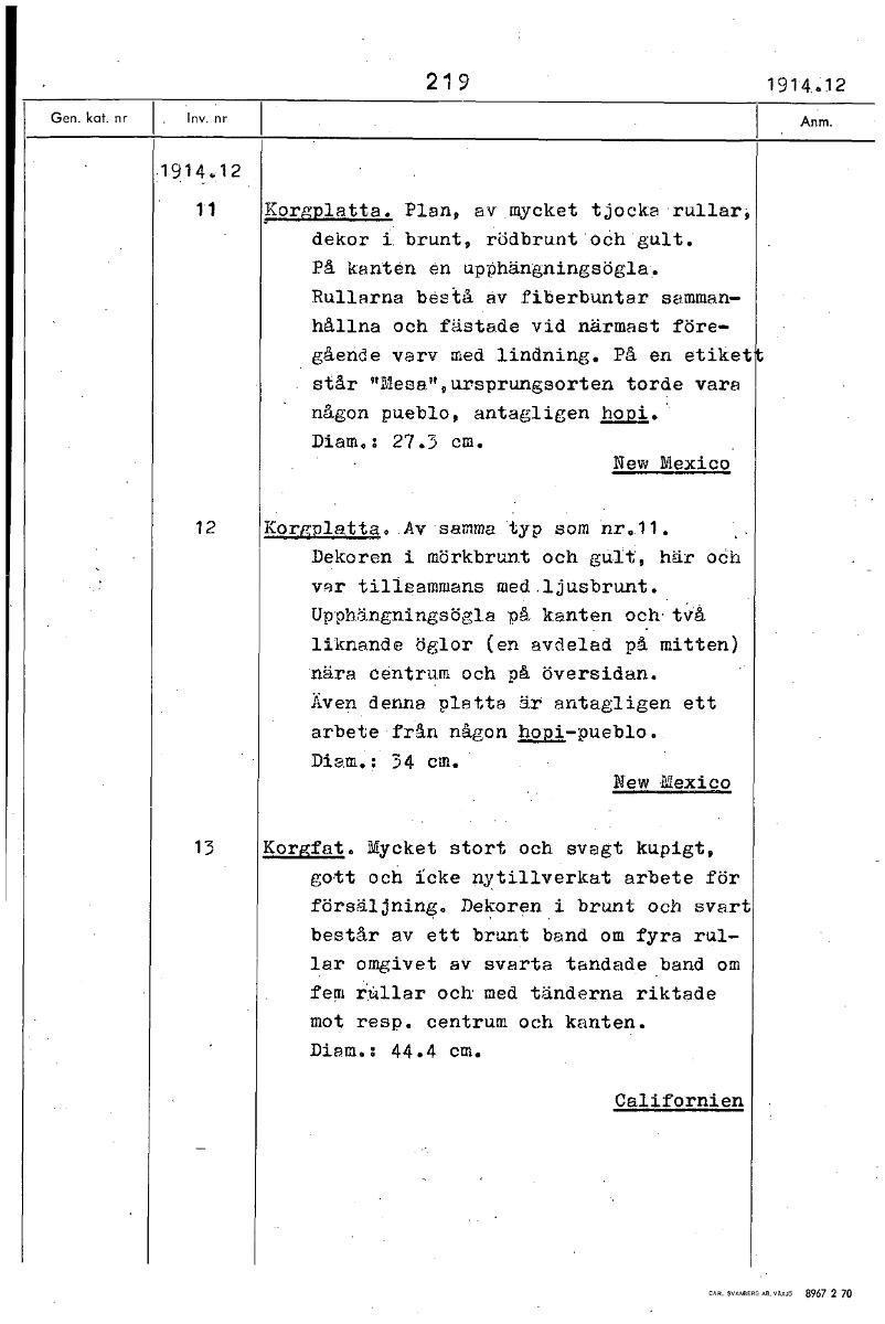 219 1914,12 1914.12 11 Korgplatta. Plan, av mycket tjocka rullar, dekor i. brunt, rödbrunt och gult. På kanten en upphängningsögla. Rullarna bestå av fiberbuntar samman- hållna och fästade vid närmast före- gående varv med lindning. På en etiket står "Mesa",ursprungsorten torde vara någon pueblo, antagligen hopi. Diam.: 27.3 cm. New Mexico 12 lAwlatta. Av samma typ som nr.11. Dekoren i mörkbrunt och viii, här och var tillsammans med.ljusbrunt. Upphängningsögla på kanten och.tVå liknande öglor (en avdelad på mitten) nära centrum och på översidan. Även denna platta är antagligen ett arbete från någon hopi7pueblo. Diam.; 34 cm. New Mexico 13 Korgfat. Mycket stort och svagt kupigt, gott och icke nytillverkat arbete för försäljning. Dekoren i brunt och svart består av ett brunt band om fyra rul- lar omgivet av svarta tandade band om fem rullar och med tänderna riktade mot resp. centrum och kanten. Diam.: 44.4 cm. Californien [ocr]