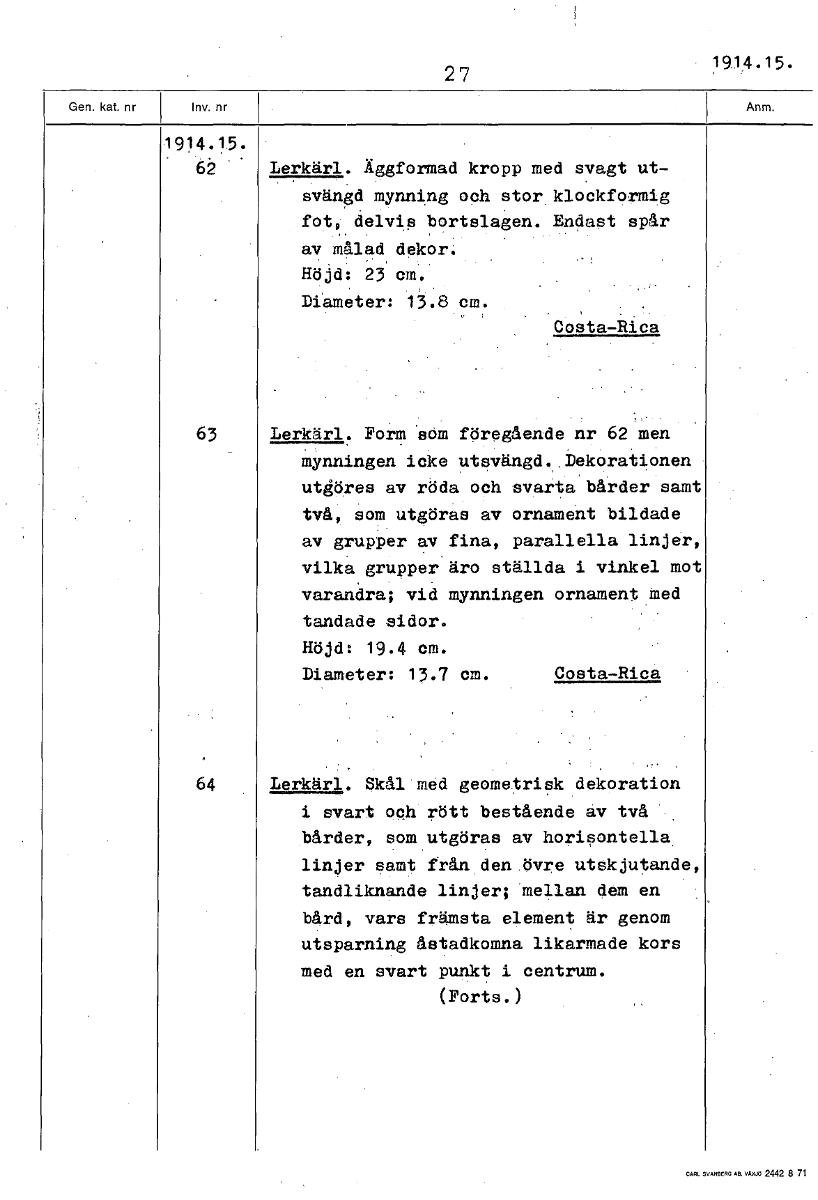 1914.15. 27 1914.15. 62 Lerkärl. Äggformad kropp med svagt ut- svängd mynning och stor klockformig fot, delvis bortslagen. Endast spår av målad dekor. Höjd: 23 cm. Diameter: 13.8 cm. Costa-Rica 63 Lerkärl. Form söm föregående nr 62 men mynningen icke utsvängd. Dekorationen utgöres av röda och svarta bårder samt två, som utgöras av ornament bildade av grupper av fina, parallella linjer, vilka grupper äro ställda i vinkel mot varandra; vid mynningen ornament med tandade sidor. Höjd: 19.4 cm. Diameter: 13.7 cm. Costa-Rica 64 Lerkärl. Skål med geometrisk dekoration i svart och rött bestående av två bårder, som utgöras av horisontella linjer samt från den övre utskjutande, tandliknande linjer; mellan dem en bård, vars främsta element är genom utsparning åstadkomna likarmade kors med en svart punkt i centrum. (Forts.) [ocr]Stäng