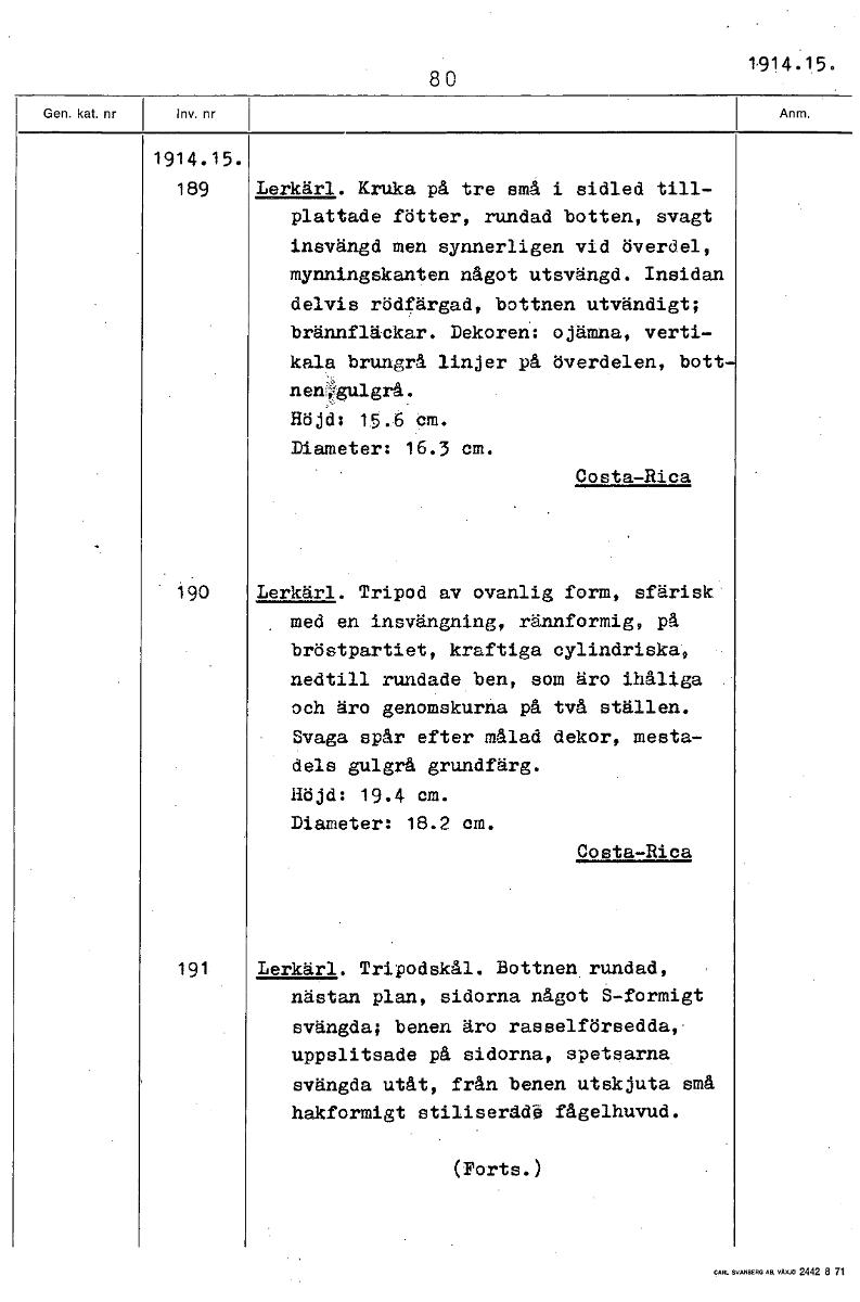 1914.15. 80 1914.15. 189 Lerkärl. Kruka på tre små i sidled till- plattade fötter, rundad botten, svagt insvängd men synnerligen vid överdel, mynningskanten något utsvängd. Insidan delvis rödfärgad, bottnen utvändigt; brännfläckar. Dekoren: ojämna, verti- kala brungrå linjer på överdelen, bott- nen,gulgrå. Höjd: 15.6 cm. Diameter: 16.3 cm. Costa-Rica 190 Lerkärl. Tripod av ovanlig form, sfärisk med en insvängning, rännformig, på bröstpartiet, kraftiga cylindriska, nedtill rundade ben, som äro ihåliga och äro genomskurna på två ställen. Svaga spår efter målad dekor, mesta- dels gulgrå grundfärg. Höjd: 19.4 cm. Diameter: 18.2 cm. Costa-Rica 191 Lerkärl. Tripodskål. Bottnen rundad, nästan plan, sidorna något S-formigt svängda; benen äro rasselförsedda, uppslitsade på sidorna, spetsarna svängda utåt, från benen utskjuta små hakformigt stiliserädå fågelhuvud. (Ports.) [ocr]