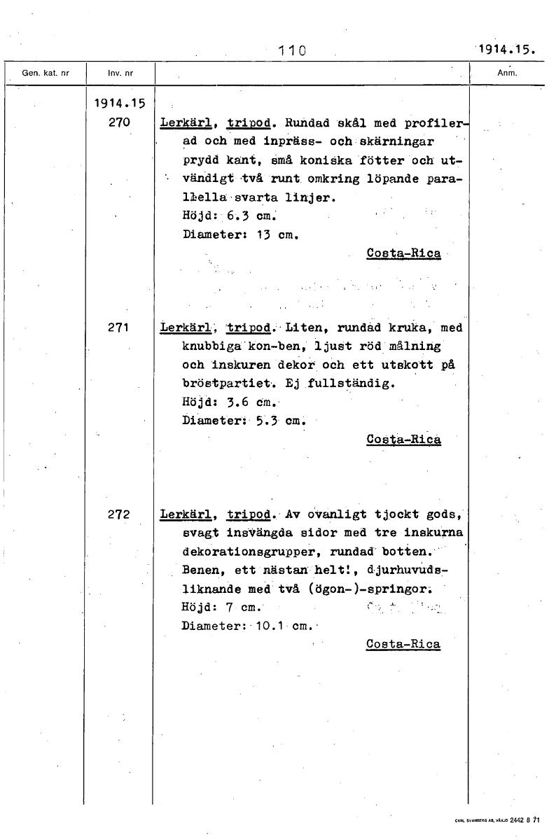 110 1914.15. 1914.15 270 Lerkärl, tripod. Rundad skål med profiler- ad och med inpräss- och skärningar prydd kant, små koniska fötter och ut- vändigt två runt omkring löpande para- llella•svarta linje...