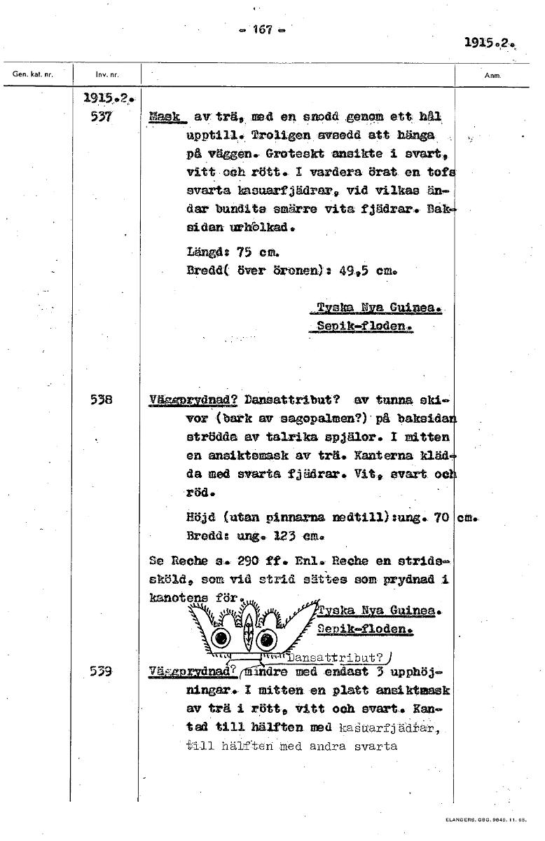 . 167 . 1915.2. 1915,2. 537 Mask avträ* med en snodd genom ett hl Troligen -avsedd att hänga. pkVäggen. Groteskt ansikte i svart,. vitt och rött. 1 vardera örat en tel' svarta kasuarfjädrar4 vid, vilk...