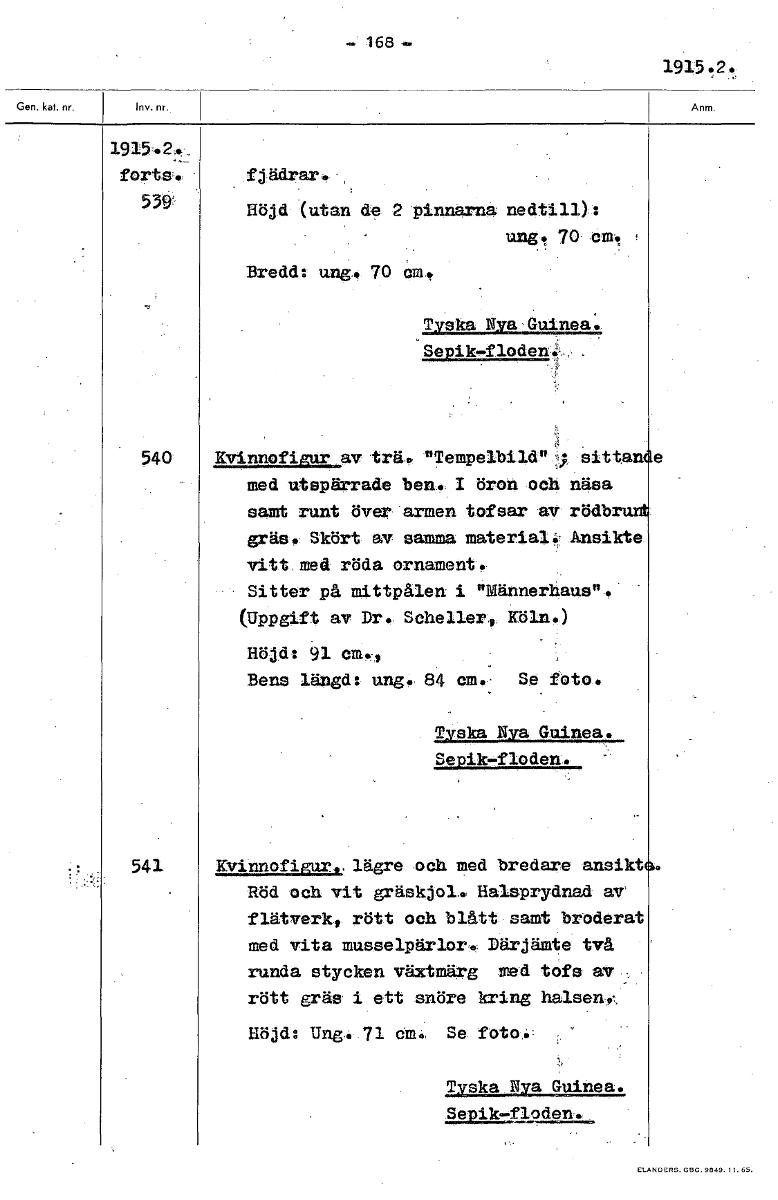 - 168- 1915.2. 1915.2._ forts. fjädrar. 539' Höjd (utan de 2 pinnarna nedtill): ung.! 70 cm. Bredd: ung. 70 Cm. Tyska Nya Guinea. Sepik-floden. 540 Kvinnofigur av trä.® nTempelbild"9- sittan e med uts...Visa hela