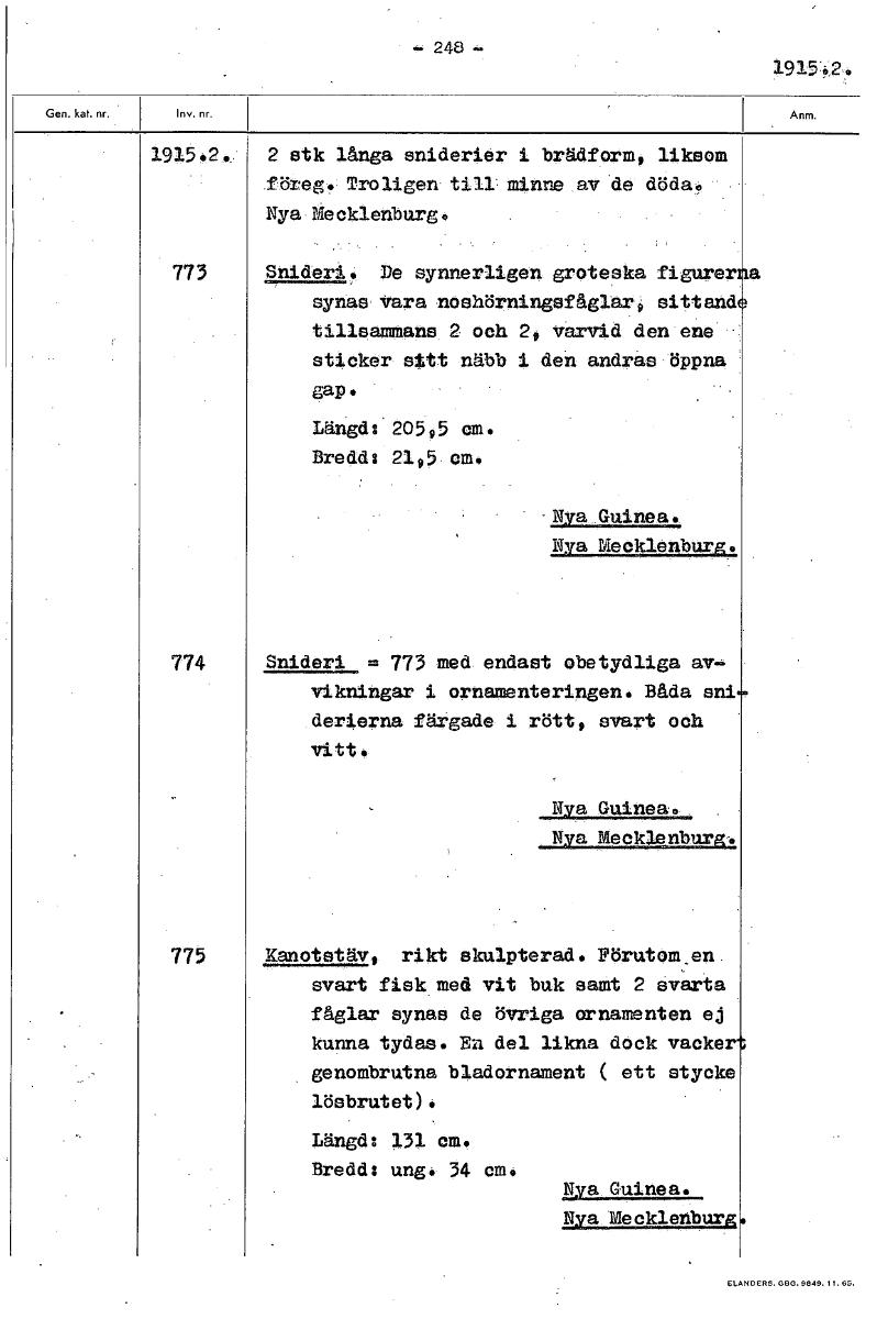 248 1925..27 1915.2, 2 stk långa sniderier i brädform9 liksom föreg. Troligen till minne av de döda. Nya Mecklenburg. 773 Snideri. De synnerligen groteska figurer a synas vara noshörningsfåglari sitta...Visa hela