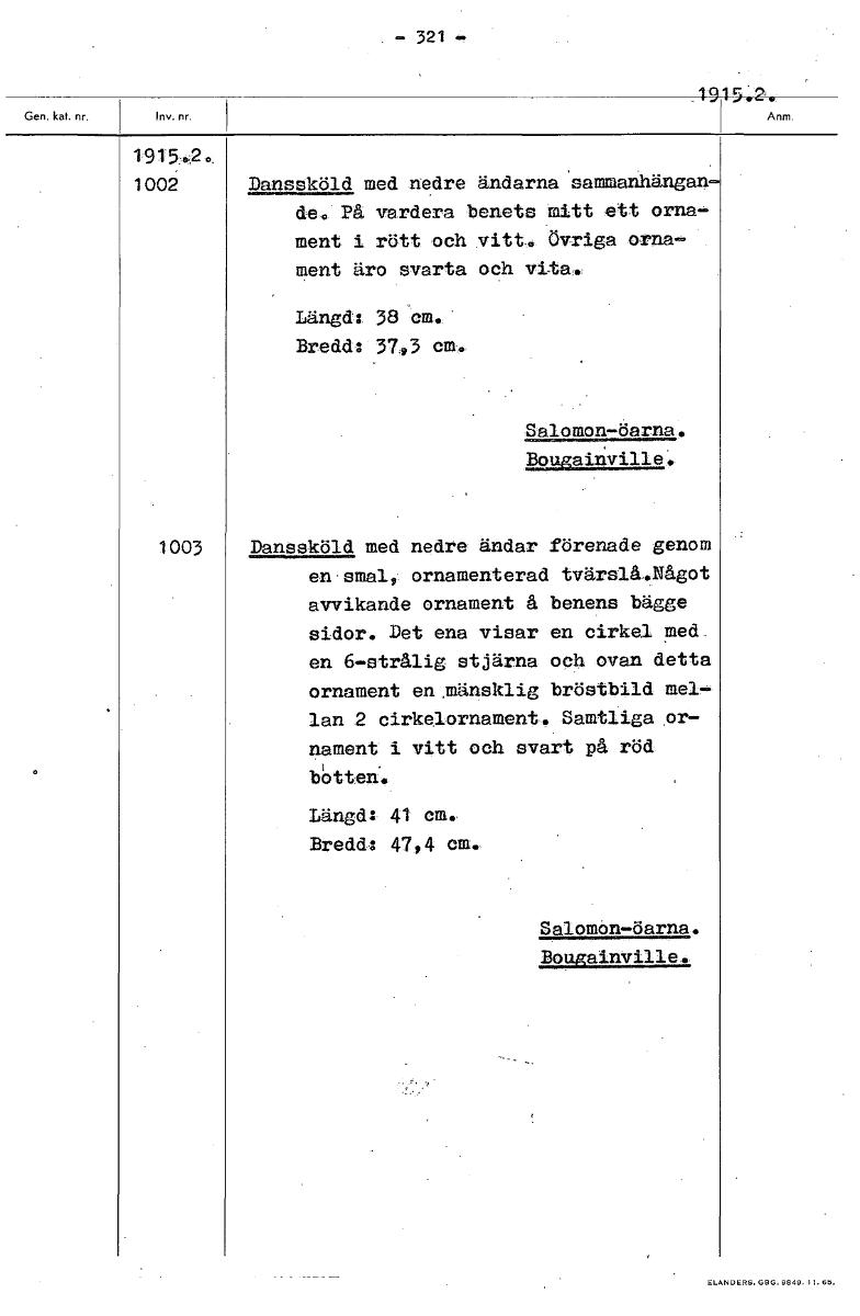 • - 321 1915;2.: 1915.2.. 1002 Danssköld med nedre ändarna sammanhängan de. På vardera benets mitt ett orna- ment i rött och vitt. Övriga orna- ment äro svarta och vita. Längd: 38 cm. Bredd: 3743 cm. Sa... Visa hela