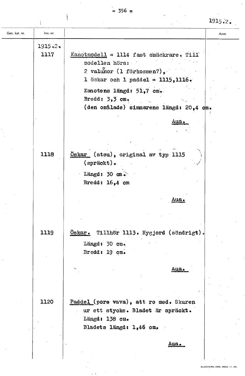 356 1915:2. 1915,2, 1117 Kanotmodell = 1114 fast Smäckrare. TilI modellen höra: 2 valtårtor (1 förkommen?)# 1 öskar och 1 paddel = 1115 1116. Kanotens längd: 51,7 em,. Bredd: 3#3 cm. (den omålade) s immarens längd: 20#4 Aua. 1118 öskar (atsu), original av typ 1115 (spräckt). Längd: 30 Bredd: 16,4 cm Aua. 1119 Öskar. Tillhör 1113. Nygjord (söndrigt). Längd: 30 Bredd: 19 cm. Aua• 1120 Paddel (pore vava)# att ro med. Skuren ur ett Stycke. Bladet är spräckt.. Längd: 138 cm. Bladets längd: 1,46 cm. Aug.. [ocr]