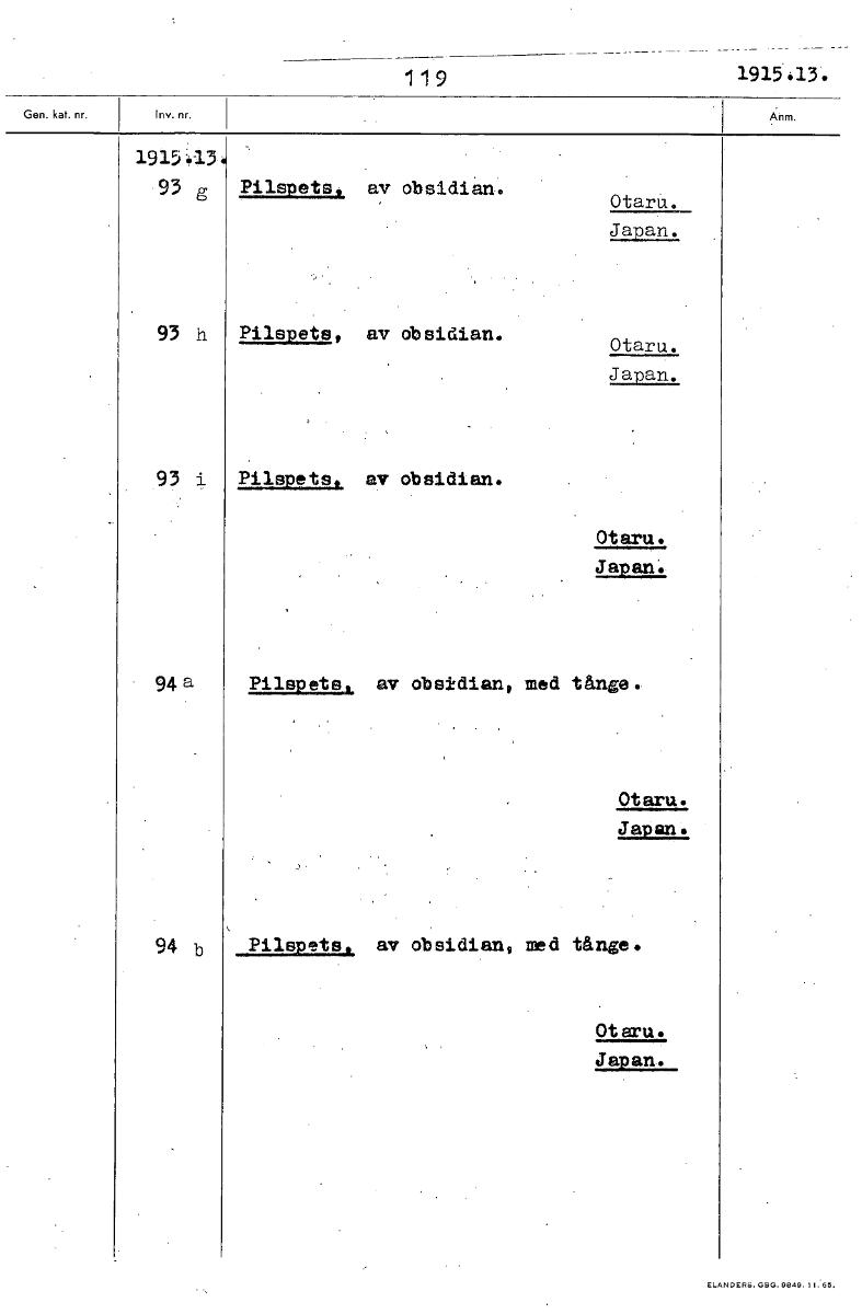 1 1 9 1915 .13. 1915 4.3 93 g Pilspets, av obsidian. Otaru. Japan. 93 h Pilspets, av obsidian. Otaru. Japan. 93 Pilspets_, av obsidian. °tara. Japan. 94 a Pilspets. av obsidian, med tånge Otaru. Japar12. 94 b Pilspets, av obsidian, med tånge. Ot aru. Japan. [ocr]
