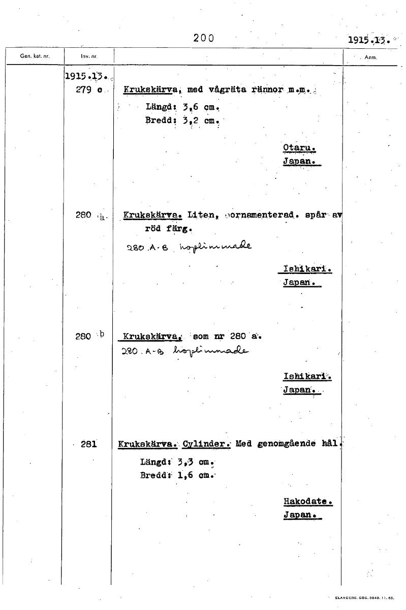 • 200 1915 438 279 0.. Krukskärva, med vågräta rnnor, fm: - Längd 3,6 em . . Bredd 3,2 om. Otaru . Japan. 280 . Krukskärva. Liten, oorngmenterad. spår- a röd färg. 22.o . A - I shi kari 280 •b KrukskärV... Visa hela