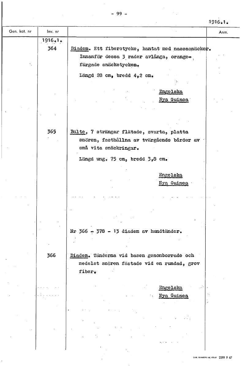 191641: 1916.1. 364 Diadem, Ett fiberstycke, kantat med nassasnäcko Innanför dessa .3 rader avlånga, orange, färgade snäckstyeken. Längd 28 cm, bredd 4,2 cm, Lwelska Nya Guinea 365 Bälte, 7 strängar flätade, svarta, platta snören, fasthållna av tvärgående bårder av små vita snäckringar. Längd ung 75 cmo bredd 308 cm. Azolska 2.9211151294 Nr 366 378 - 13 diadem av hundtänder. 366 Diadem. Tänderna vid basen genomborrade och medelst snören fästade vid en rundad, grov fiber, Engelska Nya Guinea [ocr]