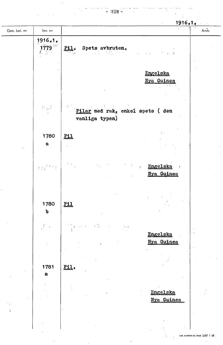 • 51:8 1916.1. 1916.1. 177 Pil. Spets avbruten. Engelska ye Guinea Pilar med rako enkel spets ( den vanliga typen) 1780 Pil a Engelska ? Nya. Guinea 1780 Pil b Engelska Nya Guinea 1781 Pil. a Engelska N... Visa hela