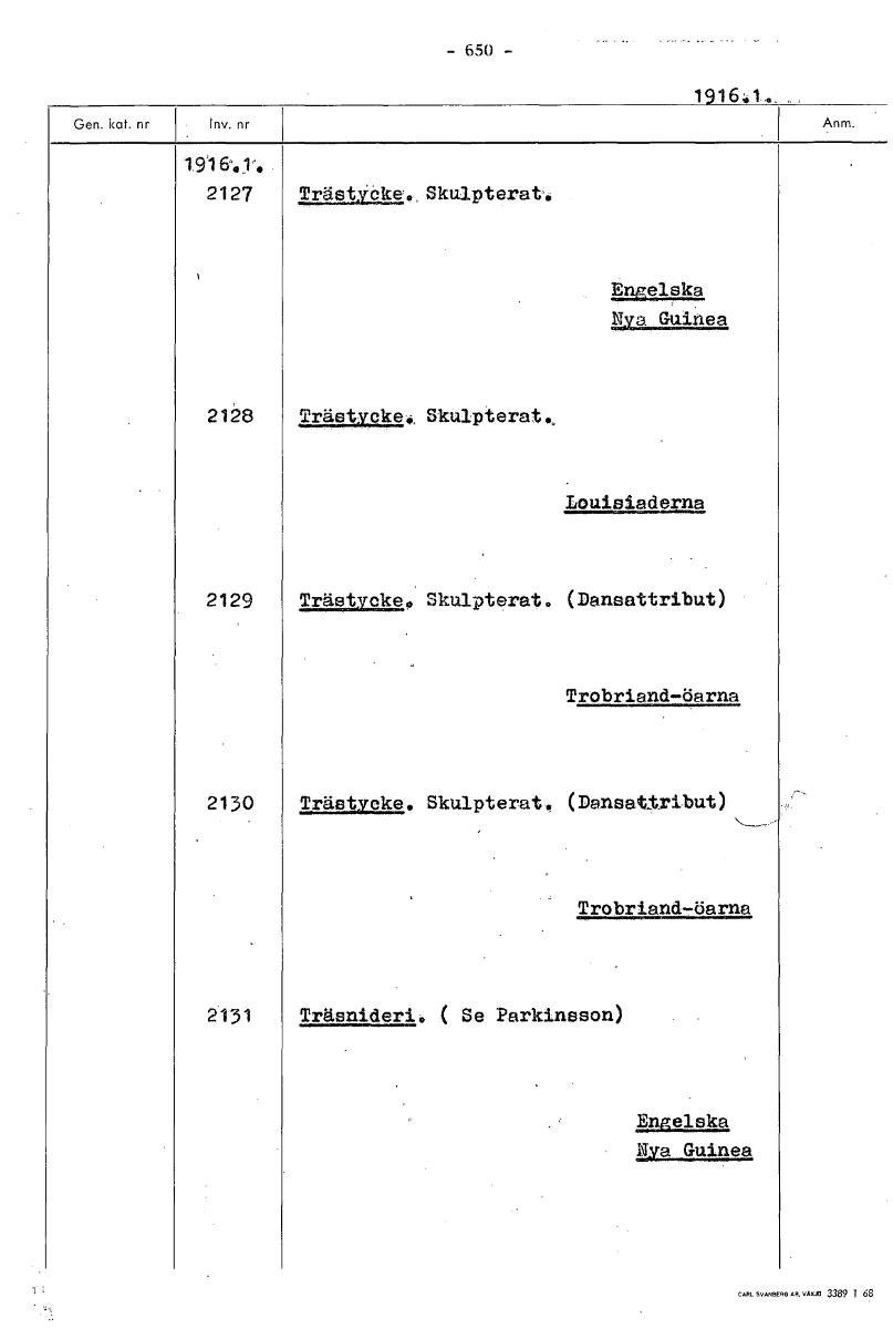 • 1916 1 ., 19164,y, 2127 Iräätkeite;„ Skulpterat, Engelska Nya Guinea 2128 Trästycke:, Skulpterat", Louisladerna 2129 Trästycke, Skulpterat, (Dansattribut) Trobriand-,öarna 2130 Trästycke, Skulpterat, ... Visa hela
