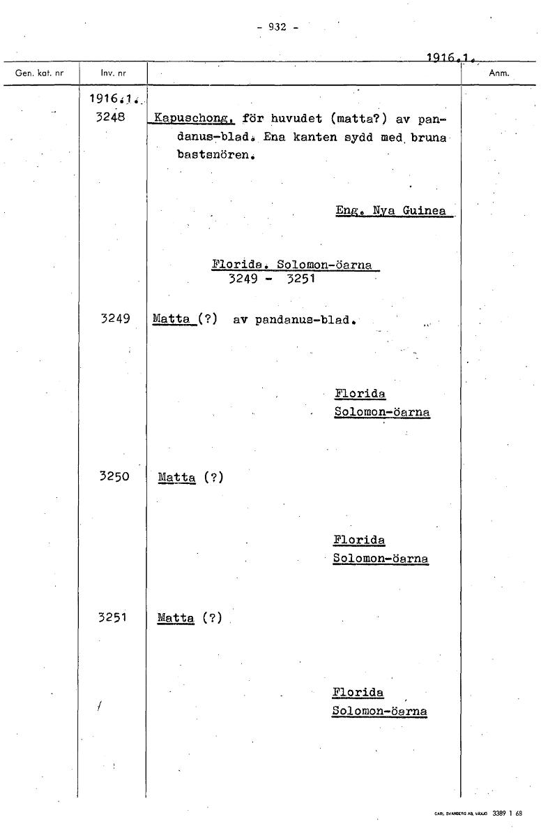 • 1916 1 191641.4 3248 Ka uschon för huvudet (matta?) av pan- danue-bladi Ena kanten sydd med, bruna bastsnören. Eng. Nya Guinea ' Florida. Solomon-öarna 3249 - 3251 3249 Matta (?) av pandanus-blad.. Fl... Visa hela