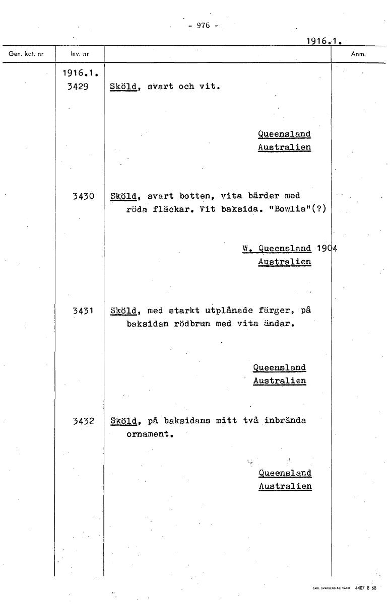 - 976 - 1916.1. 1916.1. 3429 Sköld, svart och vit. Queensland Australien 3430 Sköld, svart botten, vita bårder med röda fläckar. Vit baksida. "Bowlia"(?) W. Queensland 19 4 Australien 3431 Sköld, med starkt utplånade färger, på baksidan rödbrun med vita ändar. Queensland Australien 3432 Sköld, på baksidans mitt två inbrända ornament. Queensland Australien [ocr]