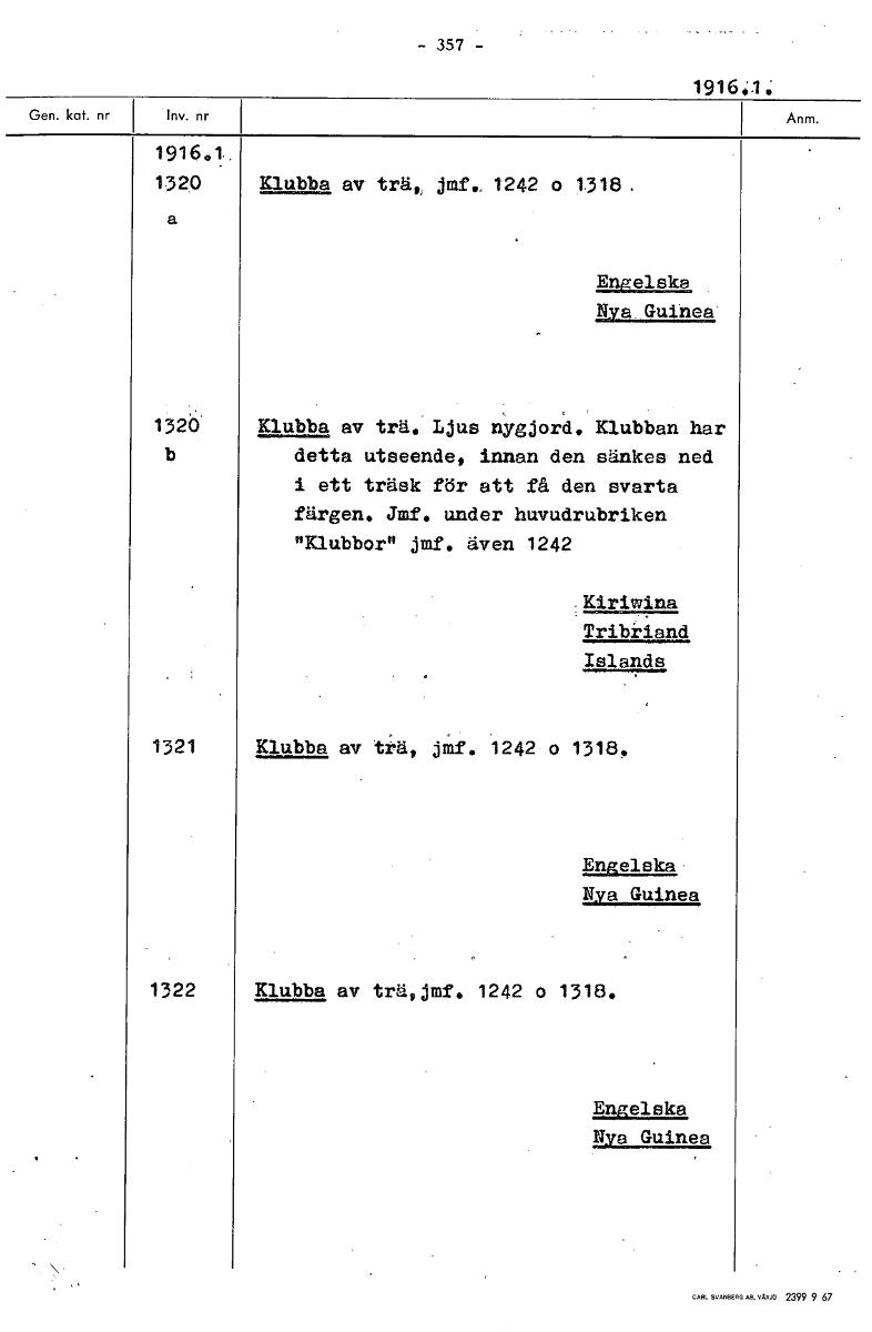 1916.1 1916,1. 1320 Klubba av trät, jmf., 1242 o 1.318 . a Engelska Nya Guinea 1326 Klubba av trä. Ljus nygjord. Klubban har 1326b detta utseende, innan den sänker ned i ett träsk för att få den svarta färgen. Jmf, under huvudrubriken "Klubbor" jmf. även 1242 Kiriwina Tribriand Islands 1321 Klubba av trä, jMf. 1242 o 1318. ångelska. Nya Guinea 1322 Klubba av trä,jmf. 1242 o 1318. Engelska Nya Guinea [ocr]
