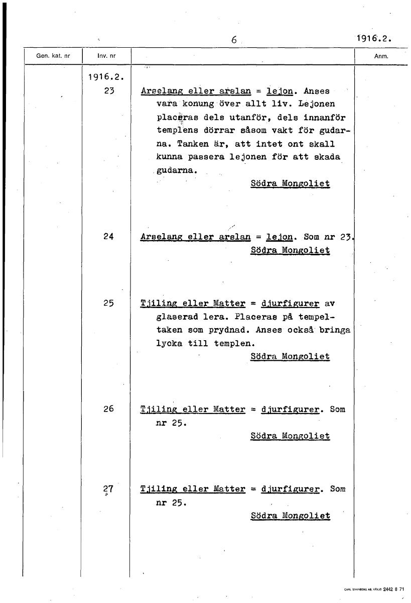1916.2. 1916.2. 23 Arselang eller arslan = lejon. Anses vara konung över allt liv. Lejonen placeras dels utanför, dels innanför templens dörrar såsom vakt för gudar- na. Tanken är, att intet ont skall kunna passera lejonen för att skada gudarna. Södra Mongoliet 24 Arselang eller arslan = lejon. Som nr 23 Södra Mongoliet 25 Tjiling eller Matter = djurfigurer av glaserad lera. Placeras på tempel- taken som prydnad. Anses också bringa lycka till templen. Södra Mongoliet 26 Tjiling eller Matter = djurfigurer. Som nr 25. Södra Mongoliet 27 Tjiling eller Matter = djurfigurer. Som nr 25. Södra Mongoliet [ocr]Stäng