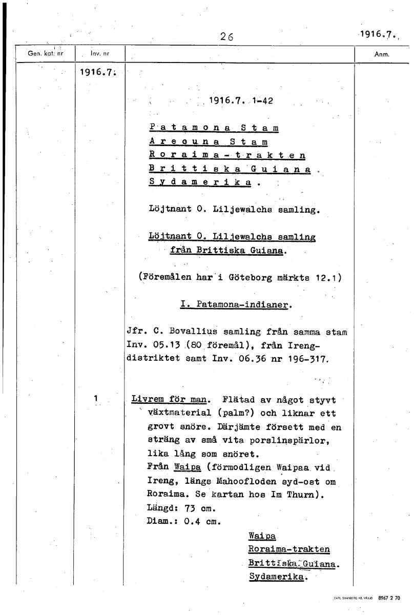 26 1 91 6 . 7 . 1916.7: 1916.7. 1 42 Patamona Stam Areouna Stam Roraima-trakten Brittiska.Guiana. Sydamerika. Löjtnant 0. Liljelyalchs samling. Löjtnant 0. Liljewalchs samling från Brittiska Guiana. (Föremålen har i Göteborg märkts 12.1) I. Patamona-indianer. Jfr. C. Bovallius samling från samma stam Inv. 05.13 (80 föremål), från Ireng- distriktet samt Inv. 06.36 nr 196-317. 1 Livrem för man. Flätad av något styvt växtmaterial (palm?) och liknar ett grovt snöre. Därjämte försett med en sträng av små vita porslinspärlor, lika lång som snöret. Från Waipa (förmodligen Waipaa vid , Ireng, längs Mahoofloden syd-ost om Roraima. Se kartan hos Im Thurn). Längd: 7.3 cm. Diam.: 0.4 cm. Waipa Roraima-trakten Brittiska":Gulana . Sydamerika: [ocr]Stäng