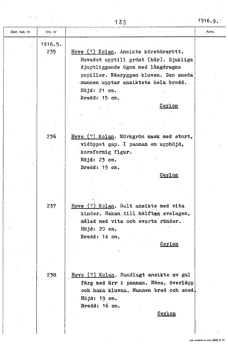 135 1916.9. 1916.9. 235 Heve (?) Kolan. Ansikte körsbärsrött: Huvudet upptill grönt (hår). Sjukliga djuptliggande' ögon med långdragna pupiller. Näsryggen kluven. Den sneda munnen upptar ansiktets hela bredd. Höjd: 21 cm. Bredd: 15 cm. Ceylon 236 Heve (?) Kolan. Mörkgrön mask med stort, vidöppet gap. I pannan en upphöjd, korsformig figur. Höjd: 23 cm. Bredd: 15 cm. Ceylon 237 Heve (?) Kolan. Gult ansikte med vita kinder. HakanAill hälftewavslagen, målad med vita och svarta ränder. Höjd: 20 cm. Bredd: 14 cm. Ceylon 238 Heve (?) Kolan. Rundlagt ansikte av gul färg med ärr i pannån. Näsa, överläpp och haka kluvna. Munnen bred och sned Höjd: 19 cm. Bredd: 16 cm. Ceylon [ocr]Stäng