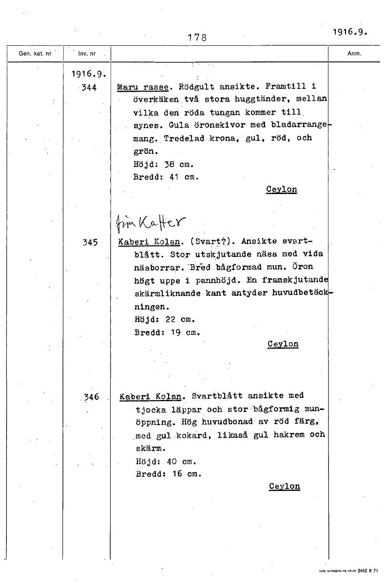 • 178 1916.9. 1916.9. 344 Maru rasse. Rödgult ansikte. Framtill i överkäken två stora huggtänder, mellan vilka den röda tungan kommer till synes. Gula öronskivor med bladarrange mang. Tredelad krona, gu... Visa hela