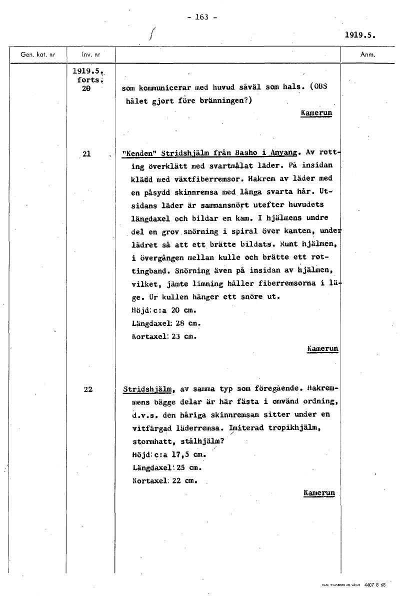-163 - 1919.5. 1919.5., forts: 20 som kommunicerar med huvud såväl som hals. (OBS hålet gjort före bränningen?) Kamerun 21 "Kenden" Stridshjälm från Basho i Anyang. Av rott ing överklätt med svartmåla...