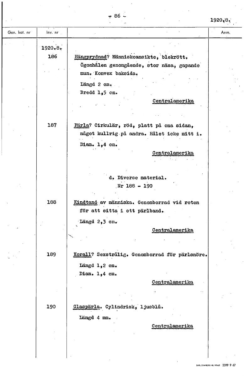 86 19201'8. 1920.4 186 Hängprydnad? MännisflOansikte, blekrött. Ogonhålen genomgående, stor näsa, gapanck mun.'Konvex baksida. Längd 2 cm.. Bredd 1,5 cm. Centralamerika 187 Pärla? Cirkulär röd, platt ...