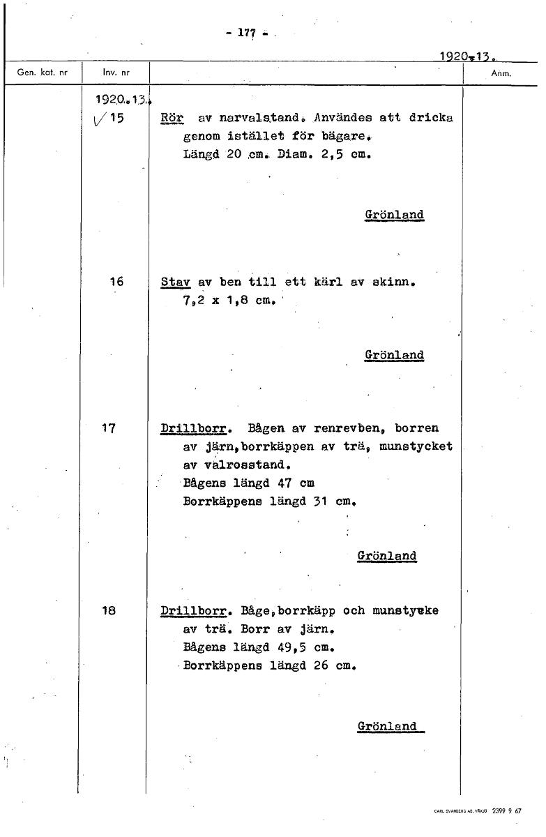 19201;13 19204.1 15 Rör av narvalstand, Användes att dricka genom istället för bägare, Längd 20 cm. Diam, 2,5 em. Grönland 16 Stav av ben till ett kärl av skinn. 702 x 1,8 cm.' Grönland 17 Drillborr. ...