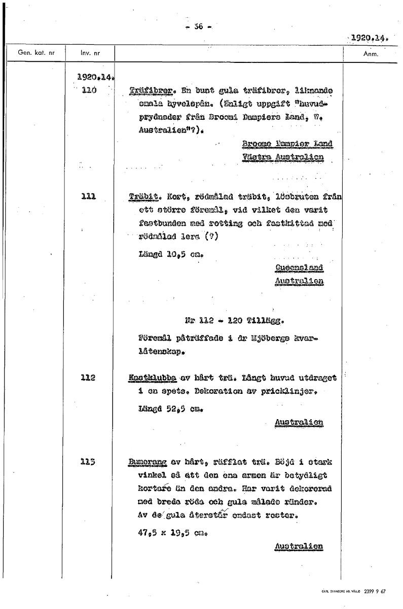 1920.14. 1920,14 llö =gam, En bunt gula träfibror9 11knunde smala hyvelspån. (Ulligt ~gift 9huvud. prydnader gran Droomi Domptera lan(1, Austra1lenn2). AnshagLIAmPler Land t al."0 111 Träbit Xort9 rödmälad träbit!, löbbruten från ett större föremå19 vid vilket den varit faatbunden med rotting och faothittad med: rödnålad lera (?) Längd 1095 em. lagai921 Auotrallea I 112 .4. 120 Tillägg. Vöremål påträffade dr WjöberGe kvar.. lätenekap• 112 Kaetklubba,av hårt tzä. lånSt huvud ute et i er spets, Dekoration av prieklinjar. laned 52,5 emo . Australien 1 3 Aleauguav hårt9 räfflat trä. Böjd i stark vinkel eå ett den ana armen är betydligt kortare än den andra. Har varit dekorerad med breda röda oc1 gula målade ränder., Av de/Gula återstår ondast rester. 4795 x 195 clu, Australien [ocr]