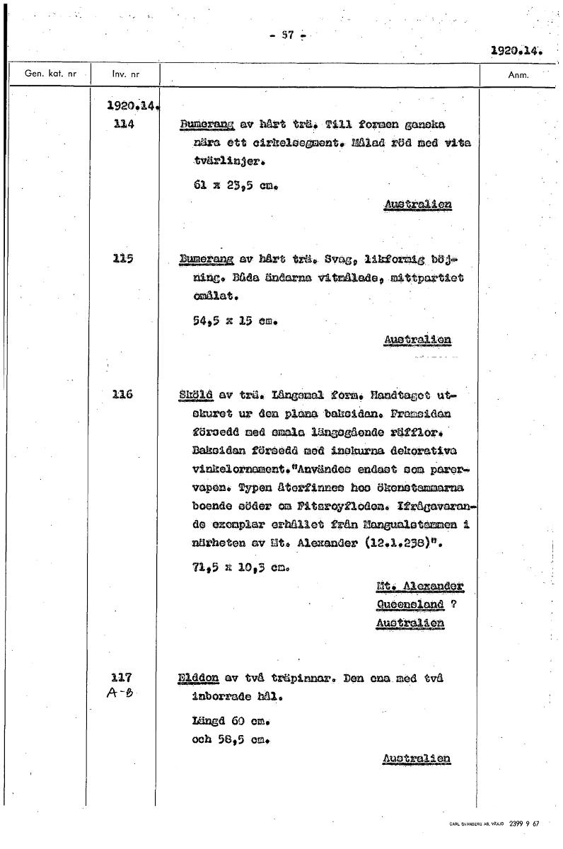 1920.14.. 1920.14. 114 Dumeraw av hårt trä, Till formen Ganska nära ett cirkelaegmet, Mälad röd med vita tvärllnjer. 61 x 2305 cm. 115 Biests ev rt tL svag, bdic° ding, Båda ändarna vitmål.,ie# mittpartiet omålat, 54,5 x 15 e 116 öld av trä. Långsmal fena, Handtaget ut- skuret ur dom Plena baksidan, Framsidan försedd med smala 3Jängs8ående räfflor, Baksidan försedd med in0hurna dekorativa vinkelornamentonAnvändes endast OOM Neer. vapen, TYPes aterfisnes hos ökonstammarna boende söder om Pitsrayflodon, Ifråeavaran- de exemplar erhållet från Danetralottumgn i närheten av Ut. Alexander (12.1.236)". 71,5 10,3 em. dt. Alexander asselen Australien 11? Elddon av två träpinnar. Den ena med tvä A -b inborrade hal. Längd 60 om, och 58,5 em. Australien [ocr]