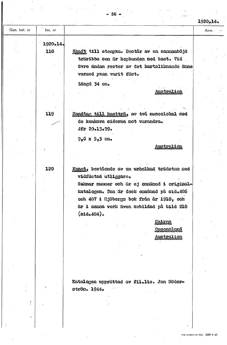 -58- 192.044 192044 118 8yott till etenYxa. Dpotår av en öjd träribba oom Ur hopbanden med b Vid övre ändan poeter av dat rteliknande ämne varmed yxan varit fäet. Längd 34 em. Atm trall en 119 and tt 1 tir a. av tVä nuaeolokal nåd de konkava eldarna mot varandra° J r 26.13.99. 990 X 5,3 em. en 120 1091" eotående av en ursol d tradat t med vid£Utad utliggare. Saknar nummer och Ur ej omnämnd i original(å katalogen. Dön är dooI omnämnd p4 oid.486 och 407 i MjUbergo bok från är 19100 och är i samma verk även avbildad Pä bild 210 (02444e4). Gairno 229299k9g. Act ilen Katalogen upprättad av £11.1io. Jan Maori. °träla° 1944. [ocr]Stäng