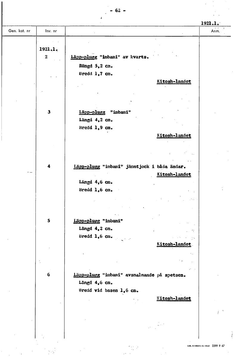-62,- 1921.1.• 1921.1. 2 Läpp-plugg "imbami" av kvarts. »ängd 5,2 cm. Bredd 1,7 cm. Kitosh-landet 3 Läpp-plugg "imbami" Längd 4,2 cm. Bredd 1,9 cm. Nitosh-landet 4 lanpzplug "imbami" jämntjock i båda ändar. Kitosh-landet Längd 4,6 cm. Bredd 1,6 cm. 5 Läpp-plugg "imbami" Längd 4,2 cm. Bredd 1,6 cm. Kitosh-landet 6 Läpp-plugg "imbami" avsmalnande på spetsen. Längd 4,6 cm. Bredd vid basen 1,6 cm. Nitosh-landet [ocr]