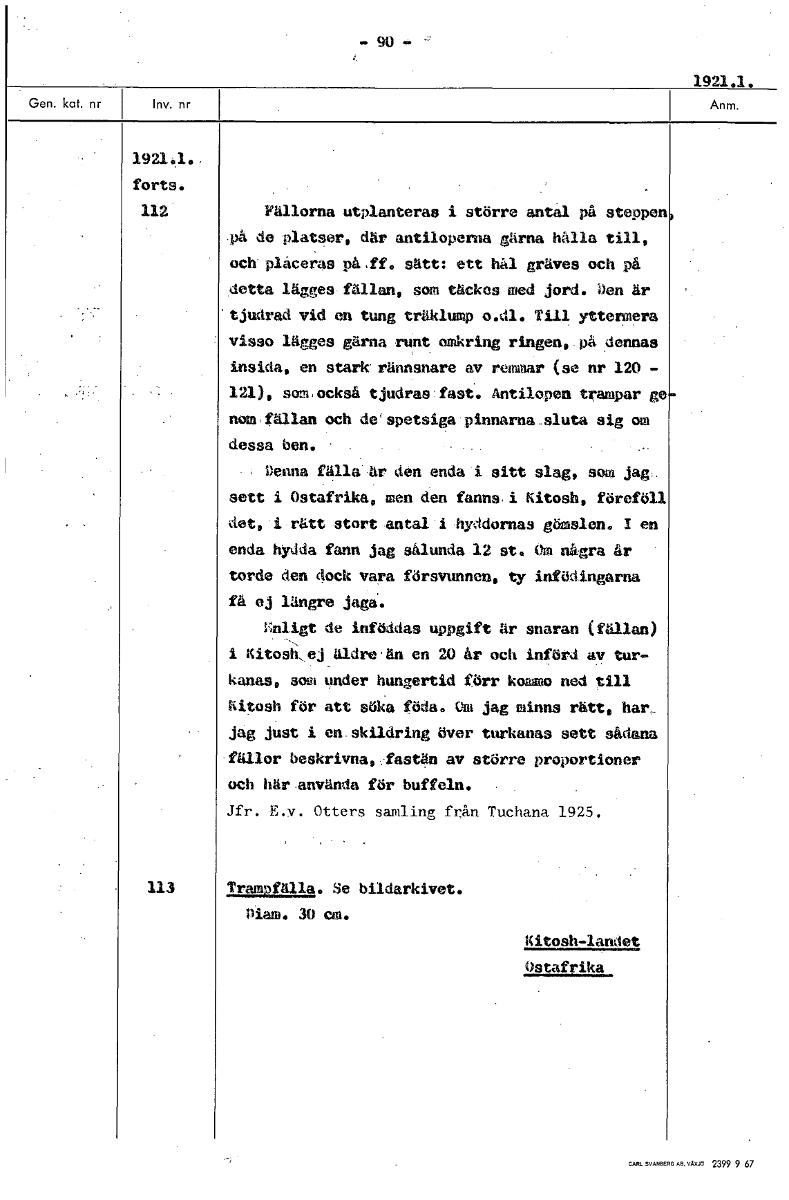 90 1921.1. 1921.1., forts. 112 Fällorna utplanteras i större antal på stoppen på de platser, där antiloperna gärna hålla till, och placeras på.ff. sätt: ett hål grävas och på detta lägges fållan, som ...