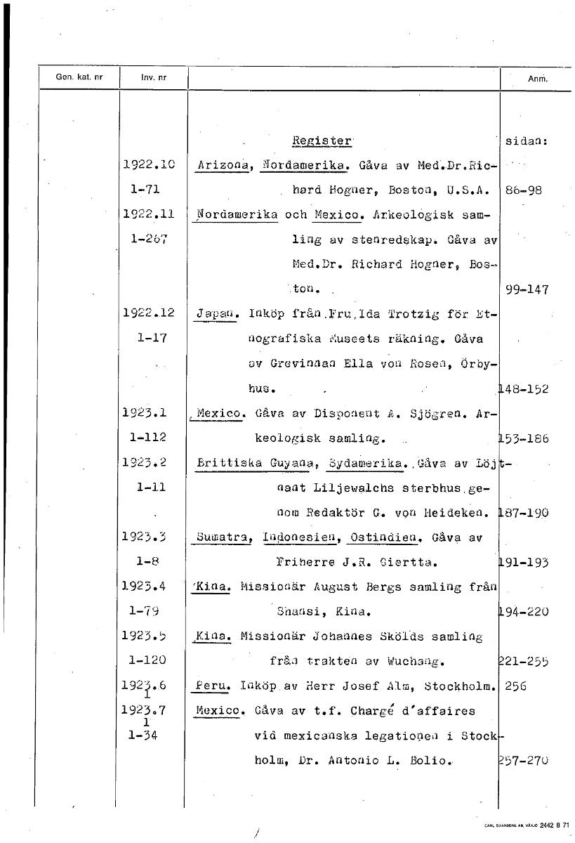 Register. sidan: 1922.10 Arizona, Nordamerika. Gåva av Med,Dr.Ric- 1-71 , hard Hogner, Boston, G.S.A. 86-98 1922.11 ylordamerika och Mexico. ArkeolOgisk sam- 1-267 ling av stenredskap. Gåva av Med.Dr....