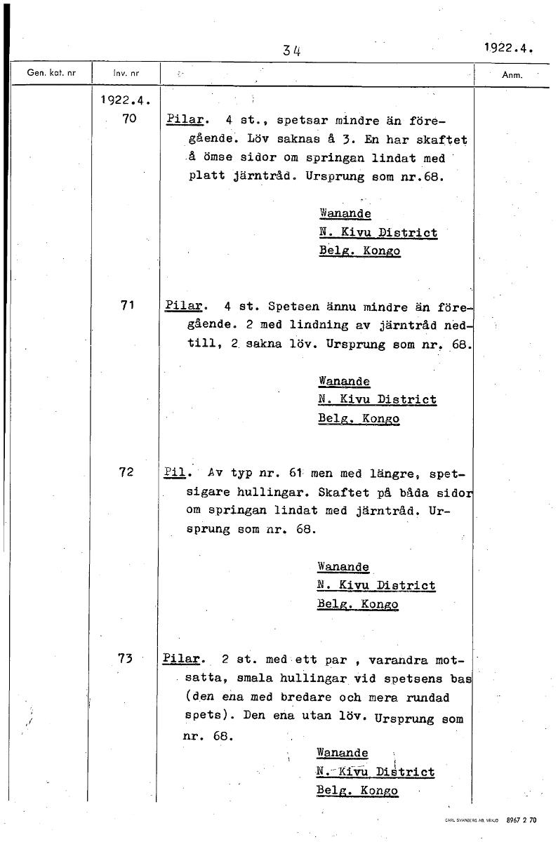 • 34 1922.4. 1922.4. 70 Pilar. 4 st., spetsar mindre än före- gående Löv saknas å 3. En har skaftet .å ömse sidor om springan lindat med • platt järntråd. Ursprung som nr.68. Wanande N. Kivu District • ... Visa hela