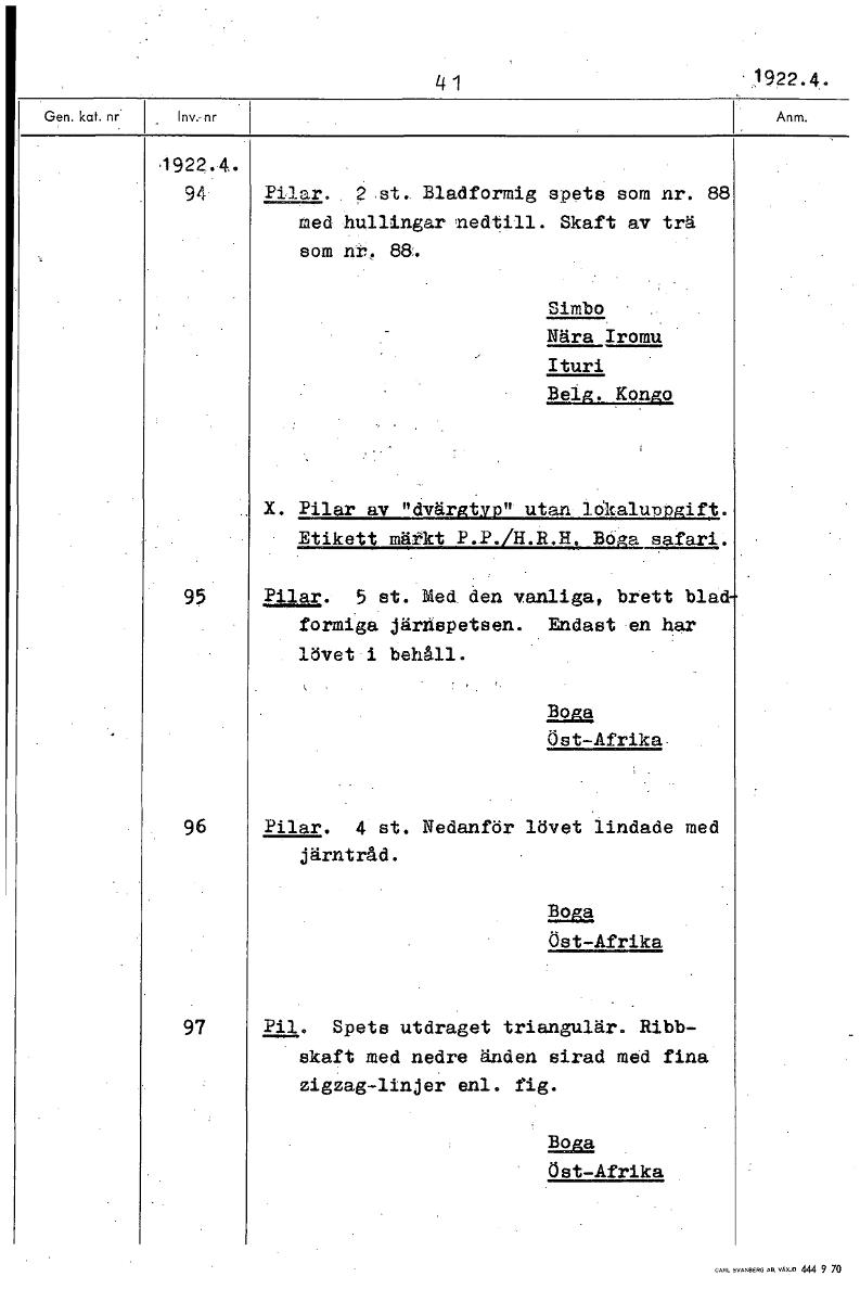 41 1922.4. 1922.4. 94 Pilar. 2 st.. Bladformig spets som nr. 88 med hullingar nedtill. Skaft av trä som nr. 88. Simbo Nära Iromu Ituri Belg. Kongo X. Pilar av "dvärgtyp" utan lokaluppgift. Etikett märkt P.P./H.R.H. Boga safari. 95 Pilar. 5 st. Med den vanliga, brett blad formiga järfispetsen. Endast en har lövet i behåll. Boga Öst-Afrika. 96 Pilar. 4 st. Nedanför lövet lindade med järntråd. Boga Öst-Afrika 97 Pil. Spets utdraget triangulär. Ribb- skaft med nedre änden sirad med fina zigzag-linjer enl. fig. Boga Öst-Afrika [ocr]Stäng