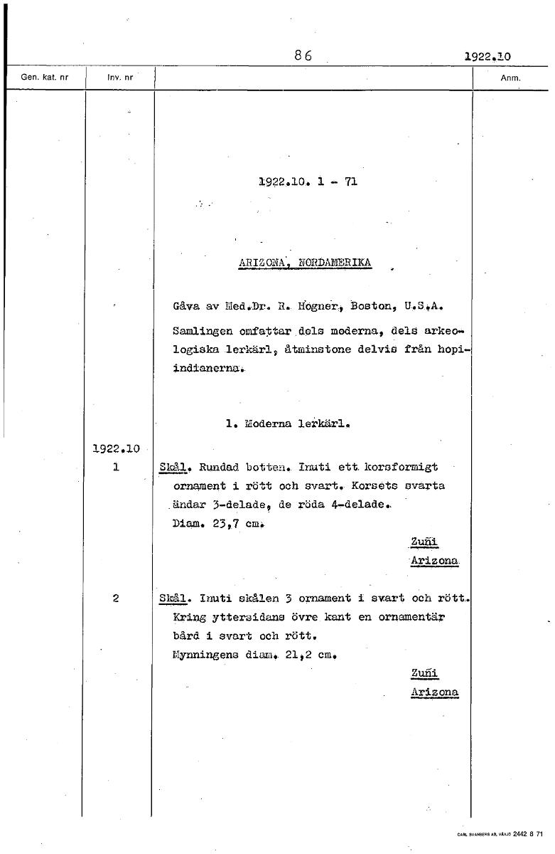 8 6 1922.2.0 1922.10. 1 - 71 ARIZONA', NORDAMERIKA Gåva av Med.Dr. R. Högner, Boston, U.S .A. Samlingen omfattar dels moderna, dels arkeo- logiska lerkärl, åtminstone delvis från hepi- indianerna. 1. ...