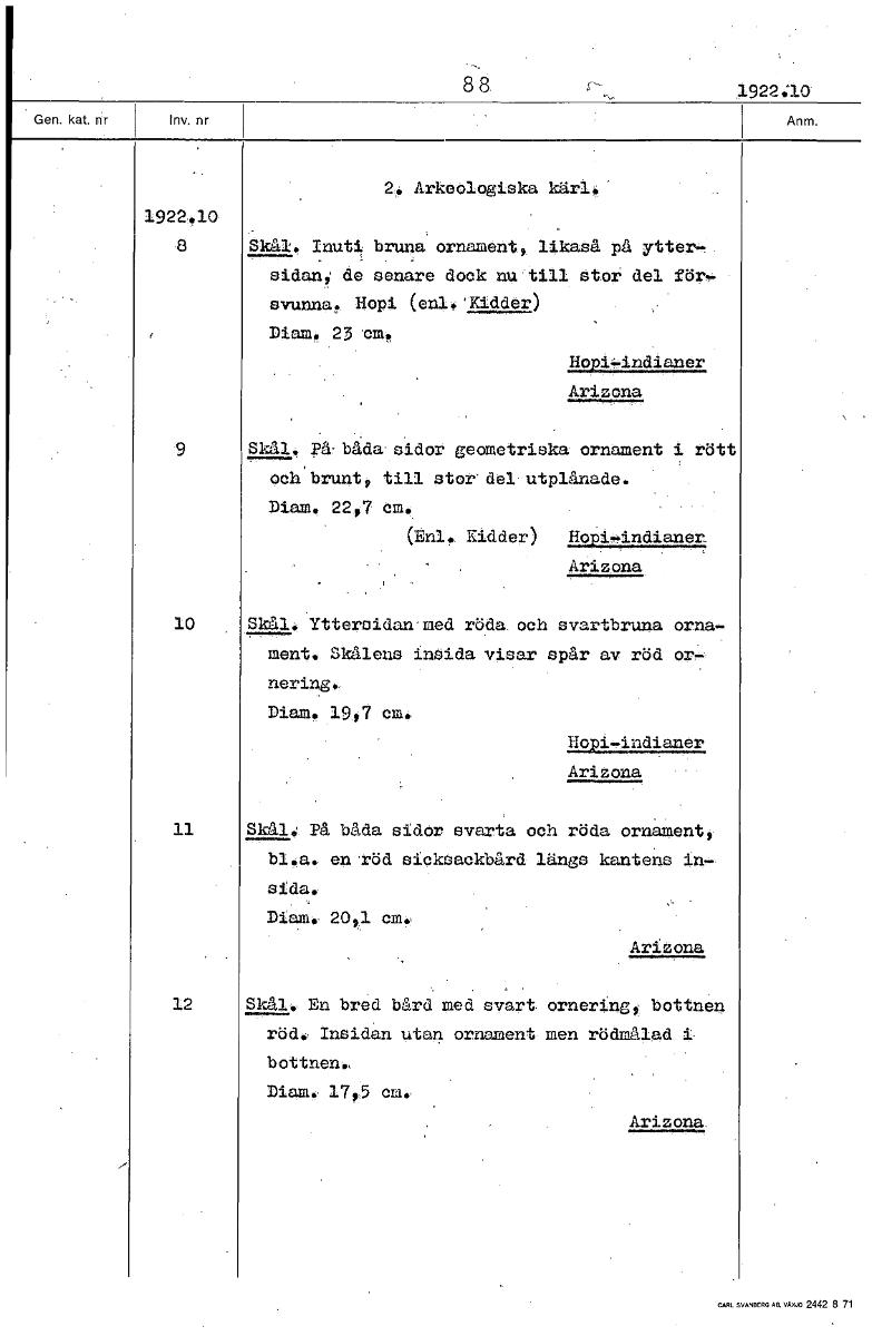 • 8 8 x.922 lo Arkeologiska kärl. 1922.10 8 Skål. Inuti bruna ornament likaså på ytter sidan,: de senare dock nu till stor del för9. svunna. Hopi (enl.'Kidder) Diam. 23 cm. H0/44-indianer Arizona 9 Skål... Visa hela