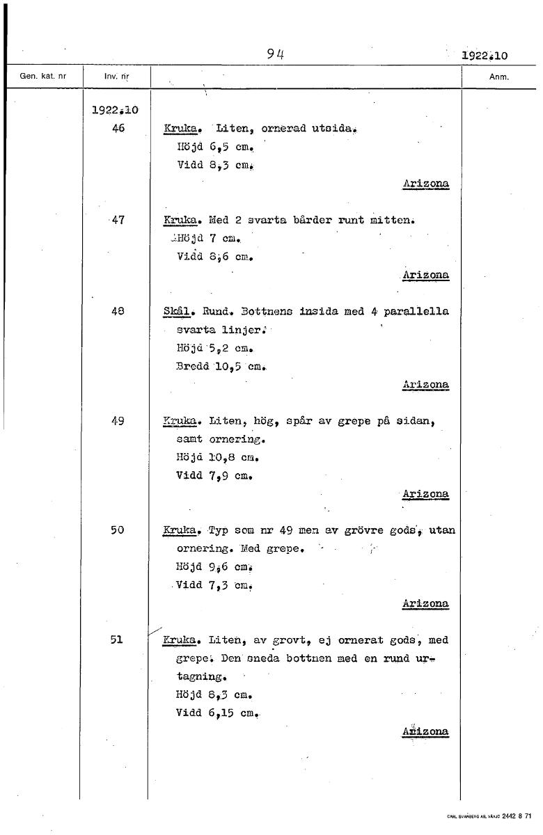 • 914 1922i10 192210 46 Kruka. Liten, ornerad utsida. Höjd 6,5 cm. Vidd 8,3 em. Arizona .47 Kruka. Med 2 svarta bårder runt Mitten. .Höjd 7 cm., Vid 806 cm. Arizona 48 Skål, Rund. Bottnens insida med 4 ... Visa hela