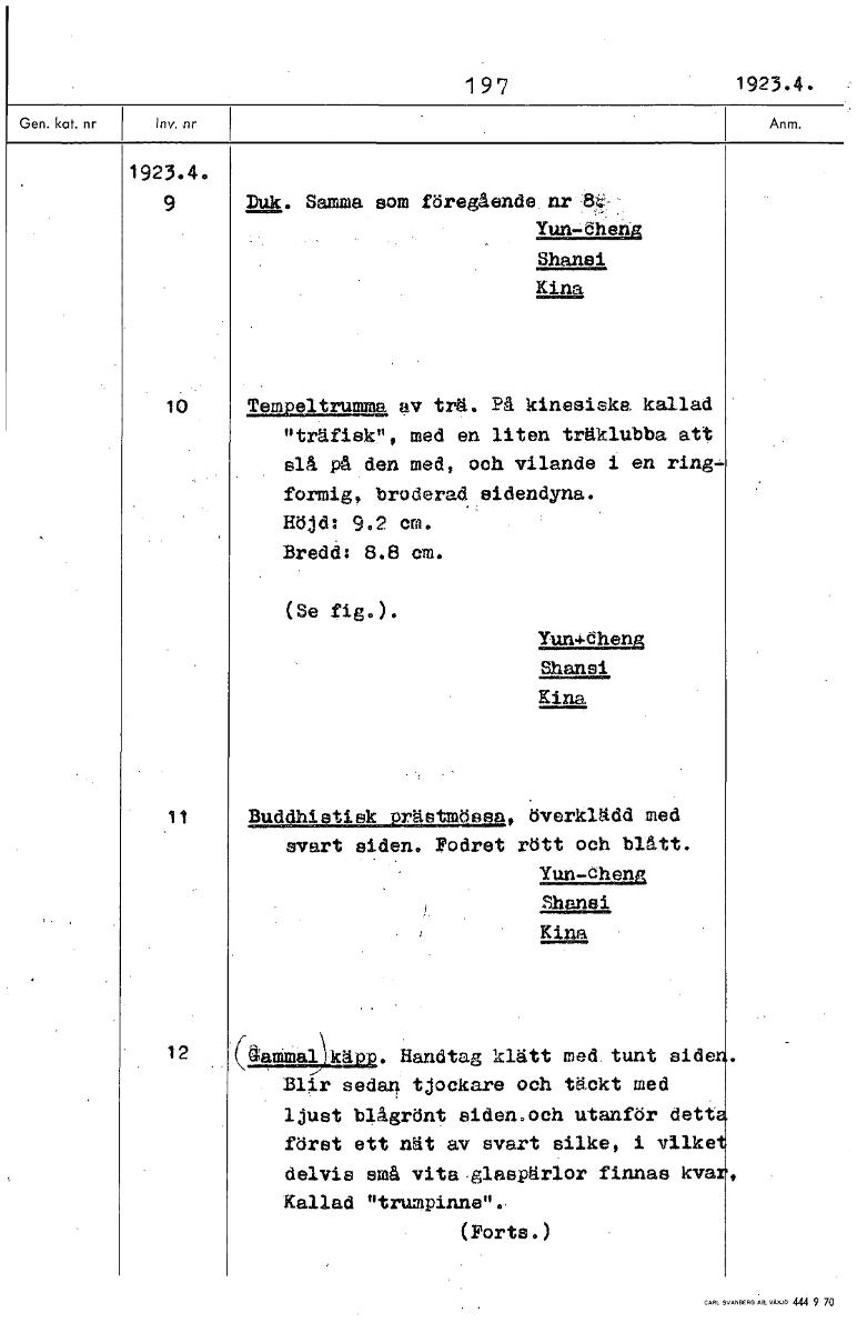 1 9 7 1923.4. 1923.4. 9 Duk. Samma som föregående nr yundheng Shansi Kina 10 Teg eltrumma av trä. På kinesiska kallad "träfisk", med en liten träklubba att slå på den med, och vilande i en ring- formig, broderad sidendyna. Höjd: 9.2 cm. Bredd: 8.8 cm. (Se fig.). Yun4-dheng Shansi Kina. Buddhi , Överklädd med svart siden. Fodret rött och blått. Yun7Oheng Shansi Kina 12 &utmal kä . Handtag klätt med tunt side Blir sedan tjockare och täckt med ljust blågrönt siden och utanför dett först ett nät av svart silke, i vilke delvis små vita .glaspärlor finnas kva Kallad "trumpinne". (Forts.) [ocr]Stäng