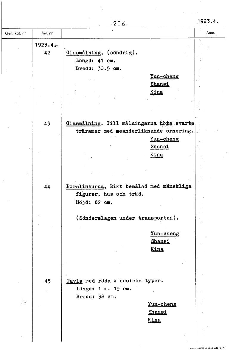 • 206 1923.4. 1923.4.- 42 Glasmålning, (söndrig). Längd: 41 cm. Bredd: 30.5 cm. Yun-cheng Shansi Kina 43 Glasmålning. Till målningarna hö'pasvarta träramar med meanderliknande ornering. Yun-cheng Shansi... Visa hela